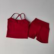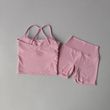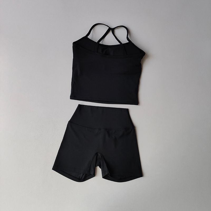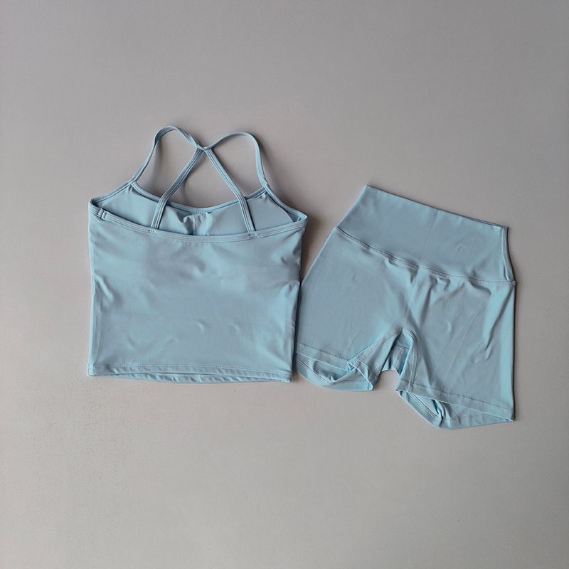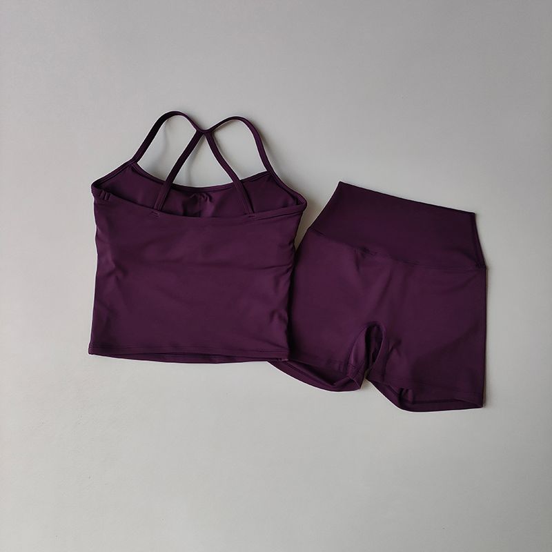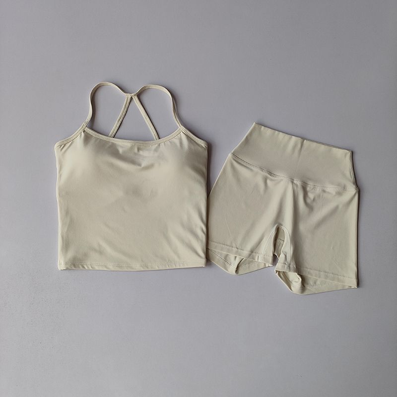 Hot selling yoga workout set with slim shoulder straps and yoga vest paired with high waisted, waist hugging, nude yoga three part shorts. Hot selling nude sports back with a strong core and a beautiful back vest. Comfortable with 80% nylon and 20% spandex stretch and support. Thin shoulder strap with hollowed out design embellishes the back contour, showcasing a perfect butterfly bone square neckline that outlines the collarbone curve and fits the body shape, making it easy to fold up the accessory breasts.