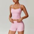 Hot selling yoga workout set with slim shoulder straps and yoga vest paired with high waisted, waist hugging, nude yoga three part shorts. Hot selling nude sports back with a strong core and a beautiful back vest. Comfortable with 80% nylon and 20% spandex stretch and support. Thin shoulder strap with hollowed out design embellishes the back contour, showcasing a perfect butterfly bone square neckline that outlines the collarbone curve and fits the body shape, making it easy to fold up the accessory breasts.