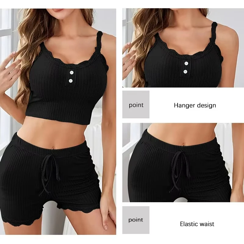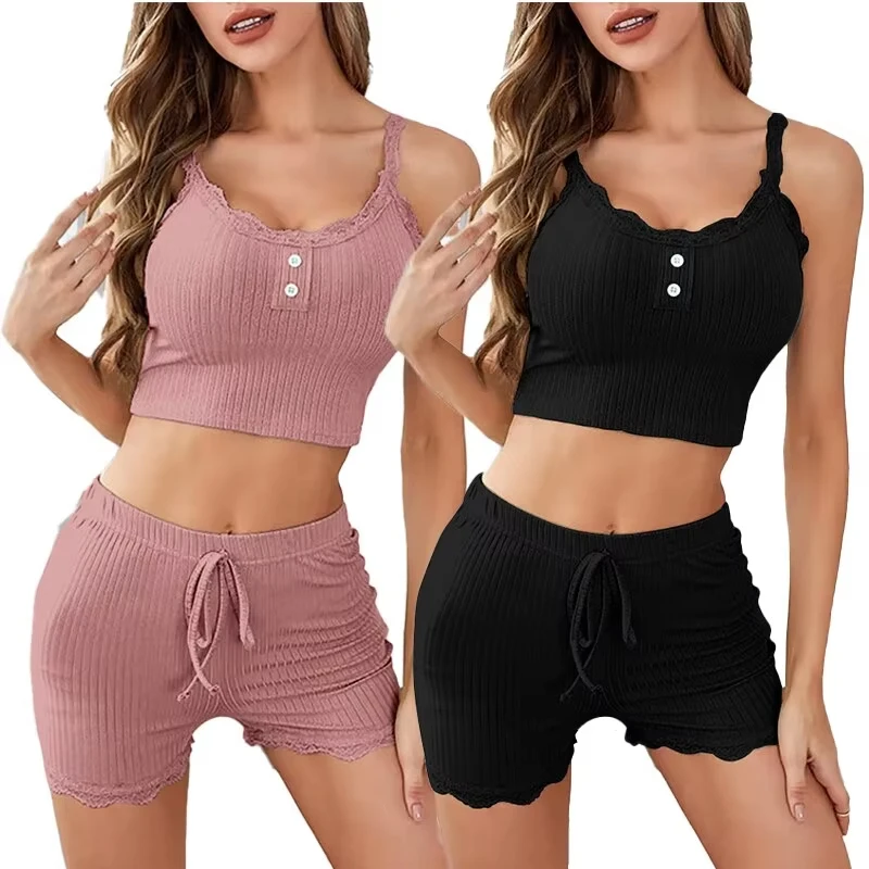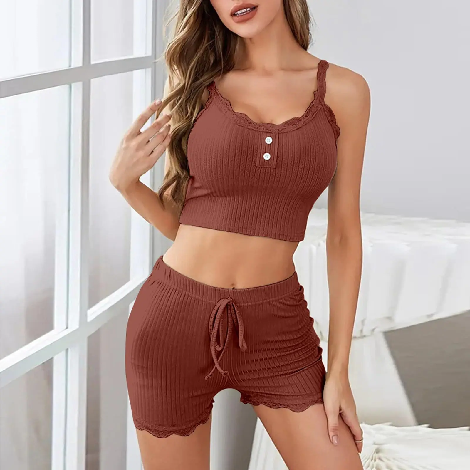 Women Sexy Pajama Set Ribbed Lace Trim Camisole Top & Shorts Summer Sleepwear Two Piece Lounge Nightwear