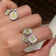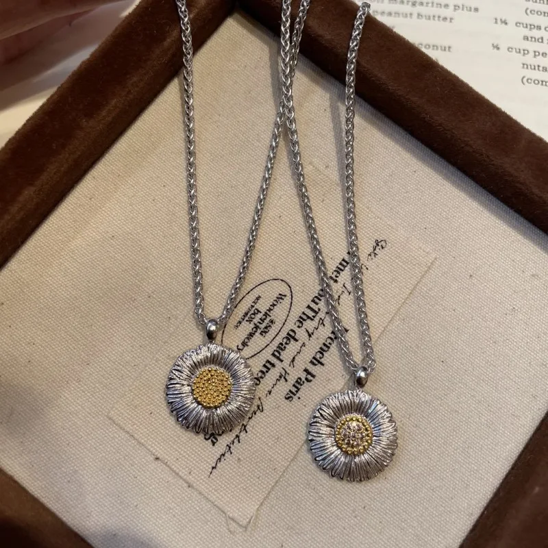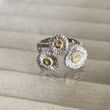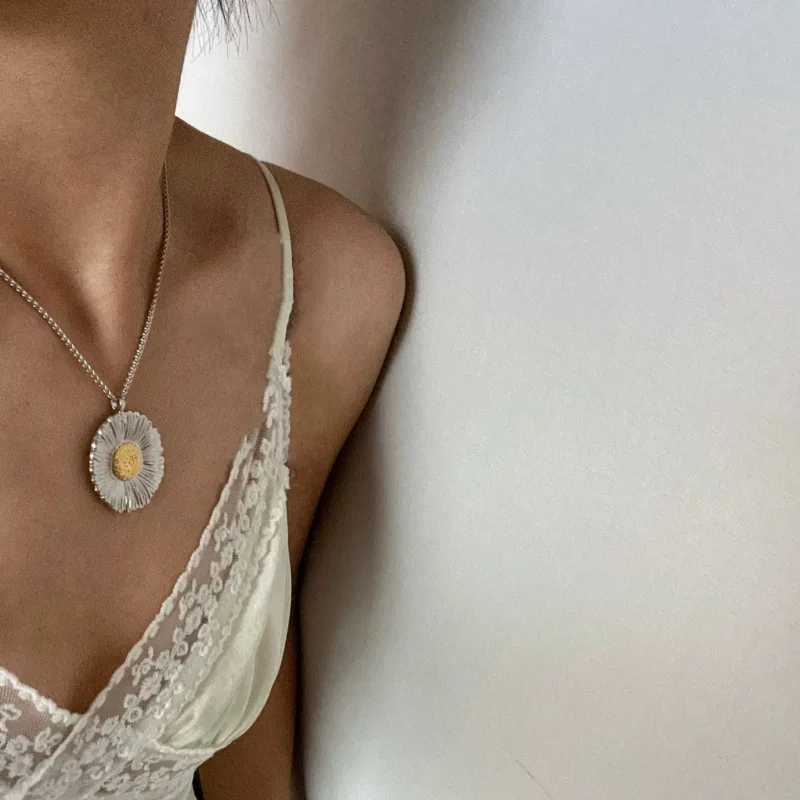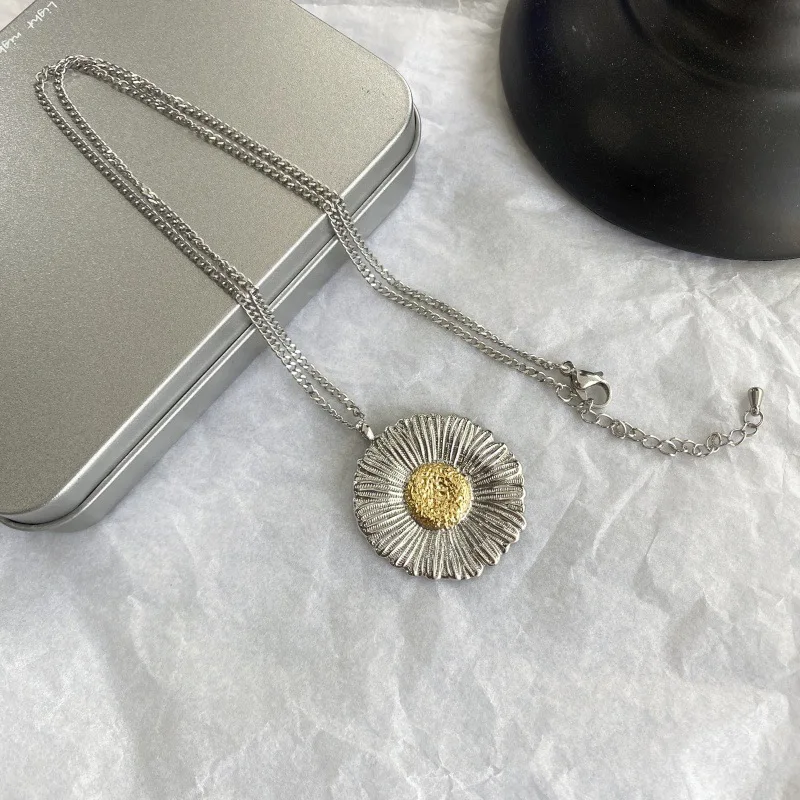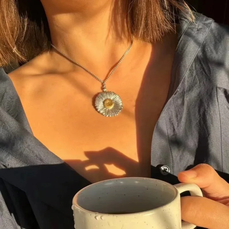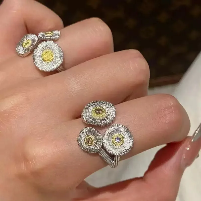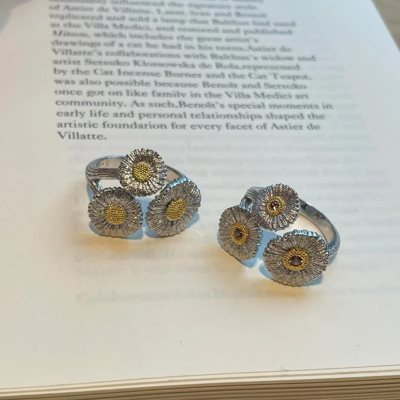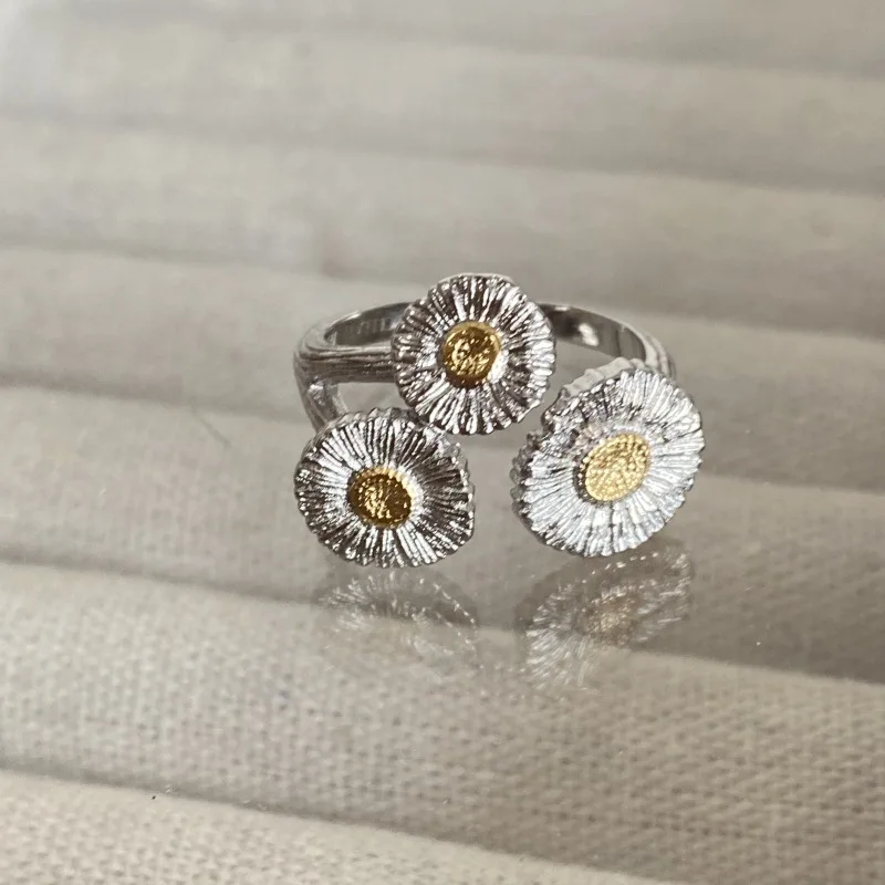Women Vintage Italian Brushed Three Daisy Ring Necklace Set