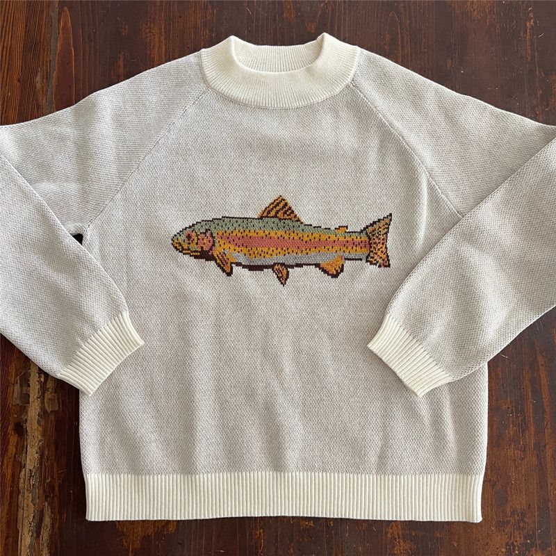 Women Y2K Contrast Fish Sweater Long Sleeve Crew Neck Ribbed Knit Pullover Sweaters Autumn Winter Casual Knitwear Tops