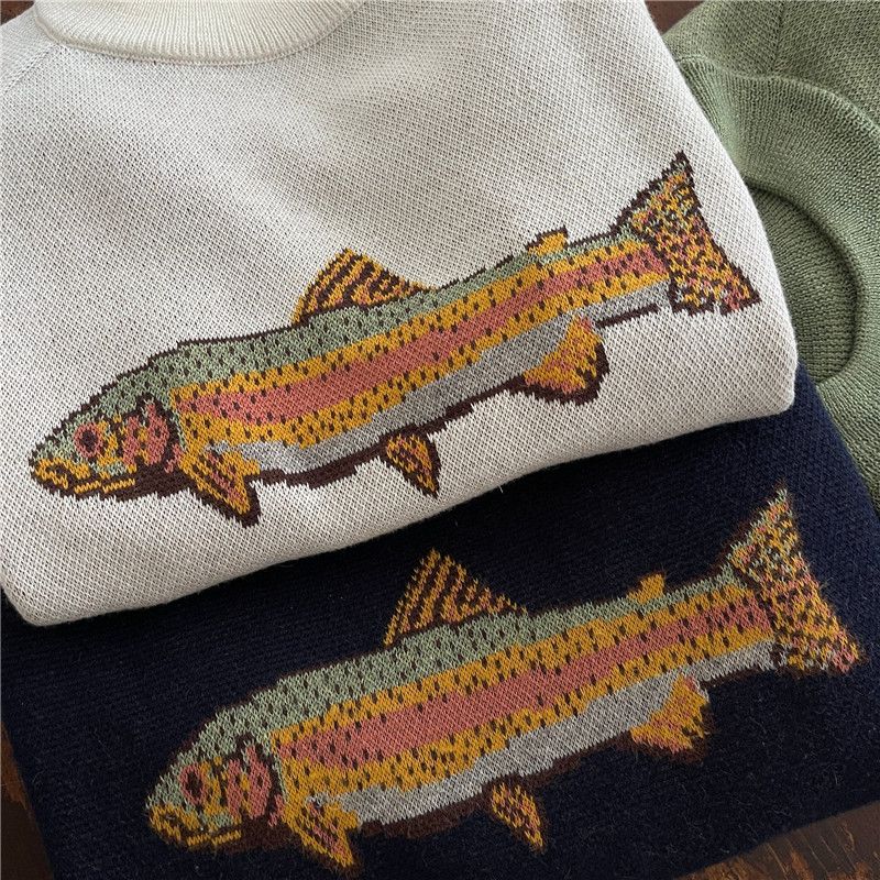 Women Y2K Contrast Fish Sweater Long Sleeve Crew Neck Ribbed Knit Pullover Sweaters Autumn Winter Casual Knitwear Tops