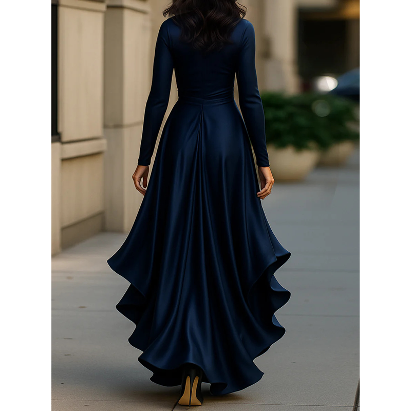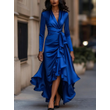 Womens Dresses 2025 Spring New Solid Color Satin V-Neck Long Sleeve Waist Cinched Irregular Ruffle Hem Elegant Party Dress