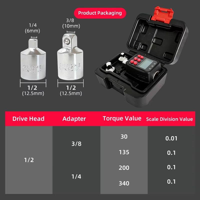 Equipped With 1/2''Drive Adapters, It Seamlessly Fits a Wide Range Of Sockets, Making It Ideal For Cars, Motorcycles, Bicycles, And Even Home Appliances. The Bright Backlight Lcd Display Stays Visible In Low-Light Garages, While Intuitive One-Button Controls Let You Switch Between N·m, Ft-Lb, And In-Lb Units In Seconds. A Built-In Buzzer And Led Alert System Notify You The Moment You Reach Your Target Torque, So You Can Work With Confidence, No Second-Guessing Required.