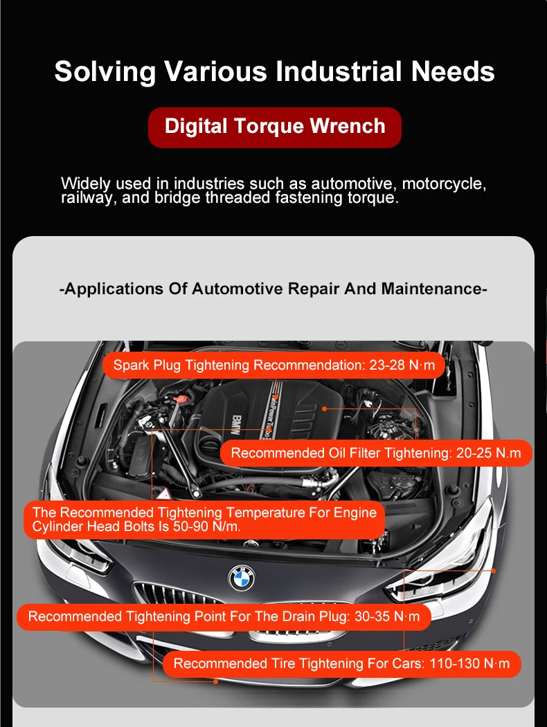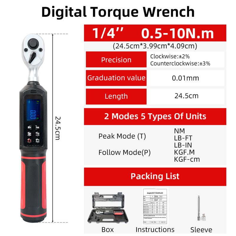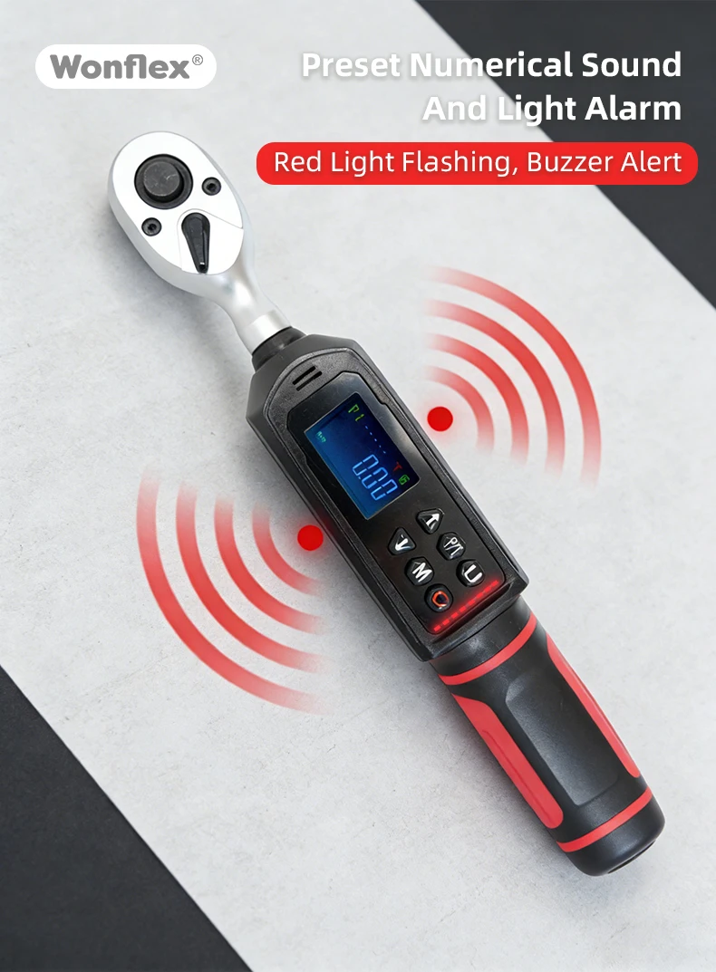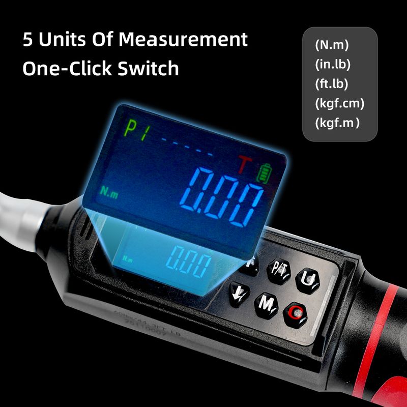 Equipped with a bright LED display and an audible buzzer alert, the wrench clearly shows real-time torque values and alerts you the moment your preset torque is reached, preventing damage to bolts or workpieces. It supports 5 interchangeable torque units (N.m, in.lb, ft.lb, kgf.cm, kgf.m) to adapt to global standards, making it perfect for auto repair, bicycle maintenance, motorcycle servicing, furniture assembly, and even electronics repair.