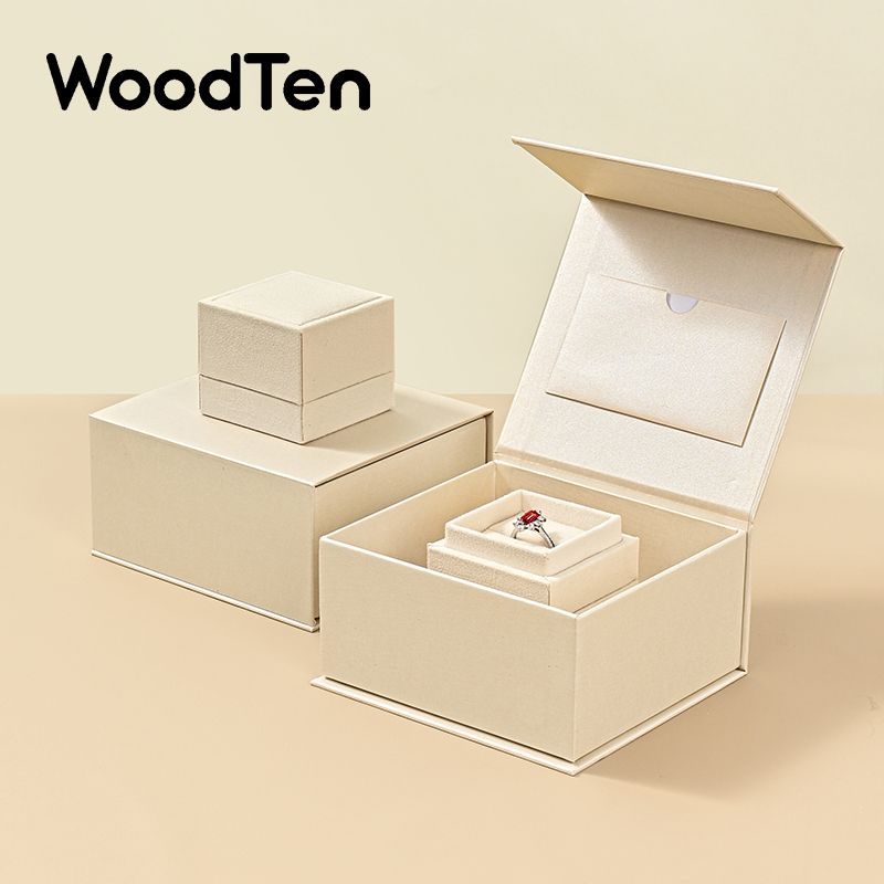 WoodTen Ring Gift Box with Lid Magnetic Jewelry Boxes for Wedding Proposal Gift Birthday Present with Card Velvet Packaging Box