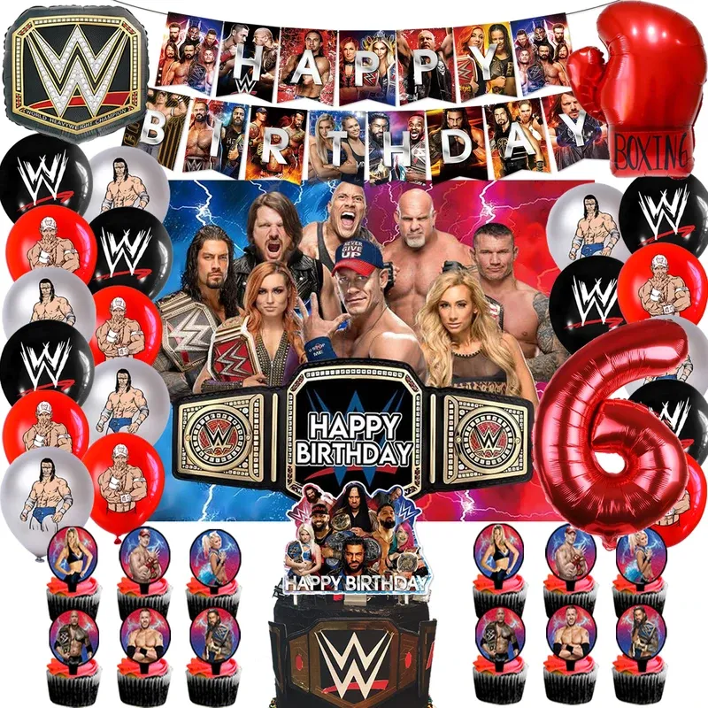 World Wrestling Theme Happy Birthday Party Decorations Fight Boxing Balloons Backdrop Cake Toppers Tablecloth Cups Supplies Toy
