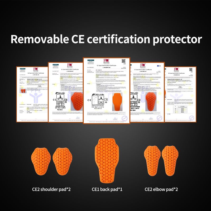 5. 【【CE-Certified Armor】 Detachable Pads (back/shoulders/elbows) with honeycomb shock absorption (60J impact), for street and track.