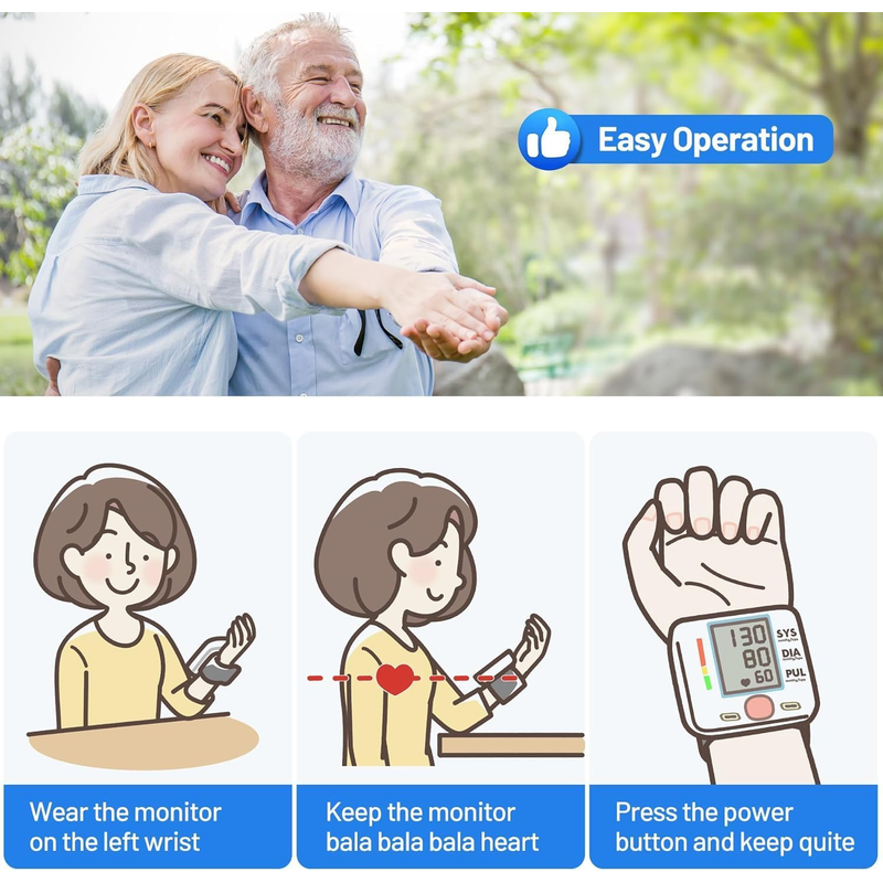 • 【Easy to Operate】: Wrist blood pressure monitor is extremely easy to use with one-button operation, you just need to wear it with palm-up and simply press the central button, your measurement readings will show in the LCD display within 1 minute.