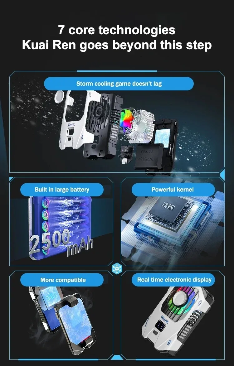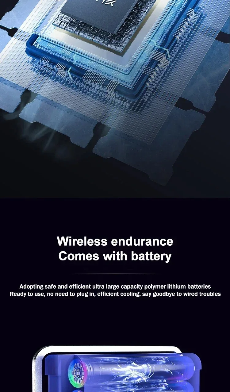 2.2500mAh built-in super large battery, using safe and efficient super large capacity polymer lithium battery, ready to use, no need to plug in, efficient cooling, say goodbye to wired troubles