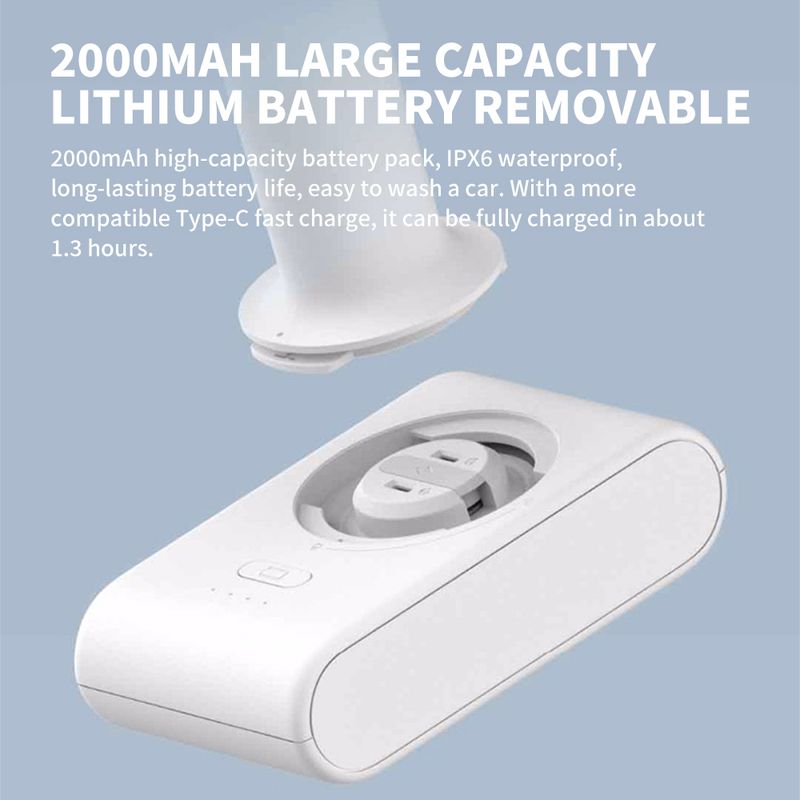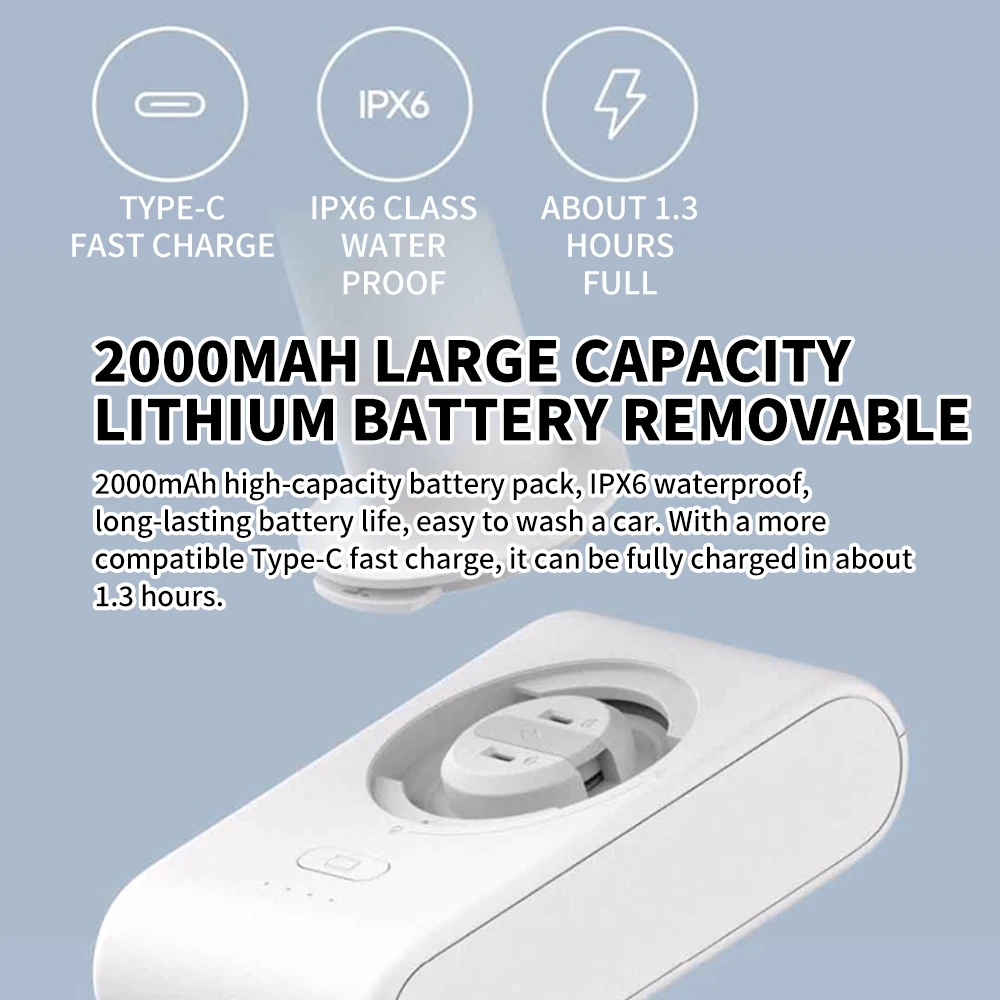 2000mAh high-capacity battery pack,lPX6 waterproof,long-lasting battery life,easy to wash a car With a more compatibleType-c fast charge, it can be fully charged in about 1.3 hours.