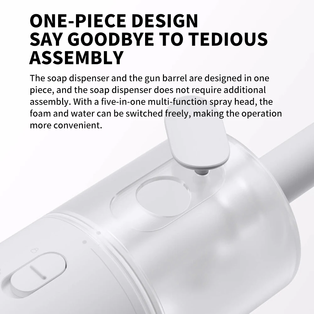 The soap dispenser and the gun barrel are designed in one piece,and the soap dispenser does not require additional assembly.With a five-in-one multi-function spray head, the foam and water can be switched freely, making the operation more convenient.