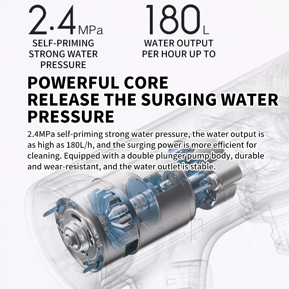 2.4MPa self-priming strong water pressure, the water output is as high as 180L/h, and the surging power is more efficient for cleaning. Equipped with a double plunger pump body, durable and wear-resistant, and the water outlet is stable.