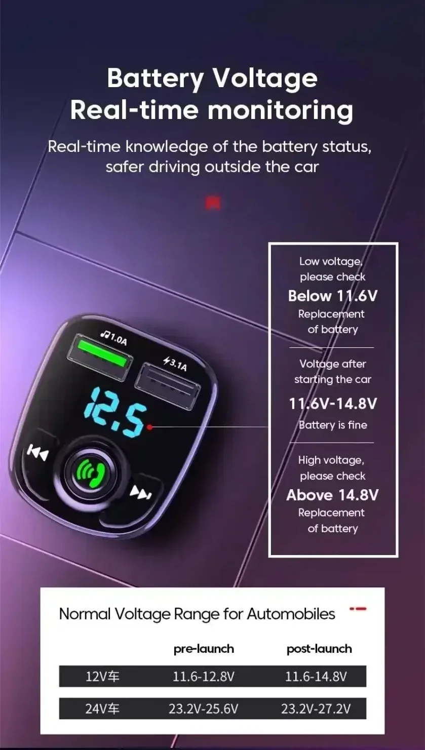 XIKCU LED MP3 Car Bluetooth FM Hands-Free Bluetooth-compaitable 5.0 Transmitter 3.1A QC3.0 PD Type C Dual USB Car Charger