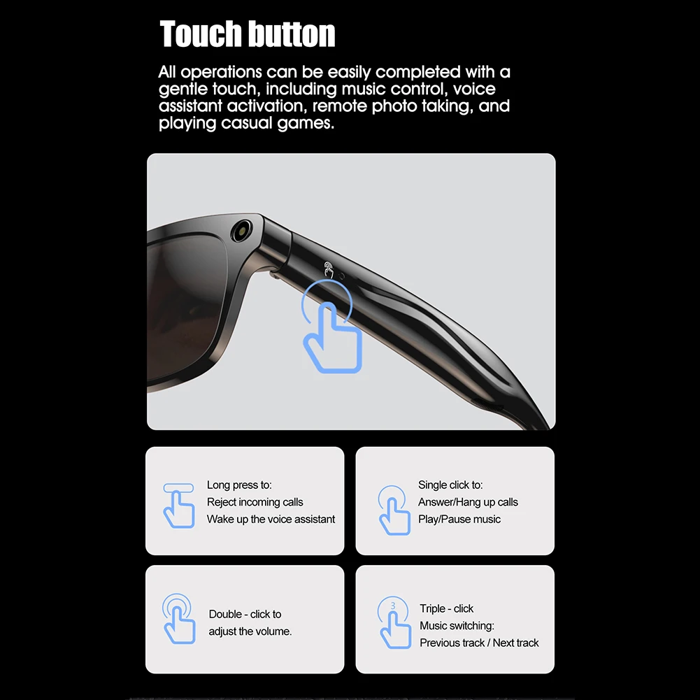 Smart Camera Glasses 1M High Definition Pixel Sports Video Glasses Touch Control Bluetooth-Compatible Glasses for Trade Business Features: 1. Ultra HD Camera and Stable Imaging: Equipped with an industry-leading 100W camera, these smart camera glasses capture crisp, high-resolution photos and videos without shaking. Enjoy clear, blur-free visuals whether you're recording adventures, snapping scenic shots, or documenting daily moments. Specification: Origin: Mainland China Color: Black ROM: 32MB RAM: 640KB Camera: 100W camera BT/BLE: BLE5.3 Data transmission: Data line data transmission Mic: 1 (chip silicon microphone) Speaker: 2 Battery type: polymer soft pack (pure cobalt + Seiko G3J) Capacity: 260mAh Charging method: wired charging Buttons: 2 physical buttons Touch buttons: 2 touch buttons LED flash: Yes Charging time: 1-1.5 hours Ship mode standby time: 1 month Theoretical standby time after power on: 15-20 days Usage time: 1-3 days Over-the-air upgrade: OTG Glasses language: 2 languages (Chinese, English) Mobile APP language: 2 languages (Chinese, English) Main functions: AI voice assistant/photo/video/recording/music control/call/prompt sound/indicator light/translation/intelligent visual recognition/touch/picture and video download/music playback (music control, local music), etc. Packaging size: 185*105*61mm/7.22*4.1*2.38in Gross weight: 268g Note: