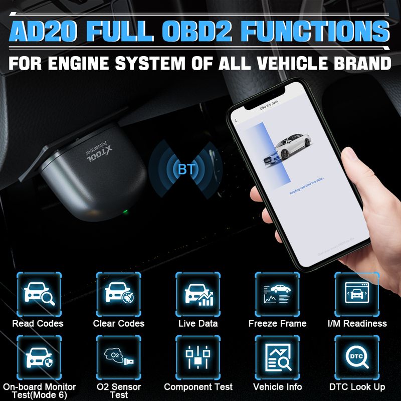 【2026 The Best-Selling Auto OBD2 Scanner on the Market: XTOOL Advancer AD20 Bluetooth OBD2 Scanner】XTOOL AD20 obd2 scanner is a user-friendly, portable OBD2 BT interface that transforms your smartphone into a sophisticated car diagnostic tool and real-time car performance monitor. The AD20 obd2 scanner diagnostic tool is capable of performing a range of functions, including💡In-depth Check for Engine💡Check engine light, Turn off MIL💡Full OBDII Tests(Mode 06)💡Monitor car performance over time💡Trip analysis 💡Driving behavior optimization 💡Live Data 💡Smart Dash 💡Battery check etc. The AD20 provides a cost-effective and straightforward solution for car owners, DIY mechanics and home users to diagnose vehicle issues before they require costly repairs at a dealership.