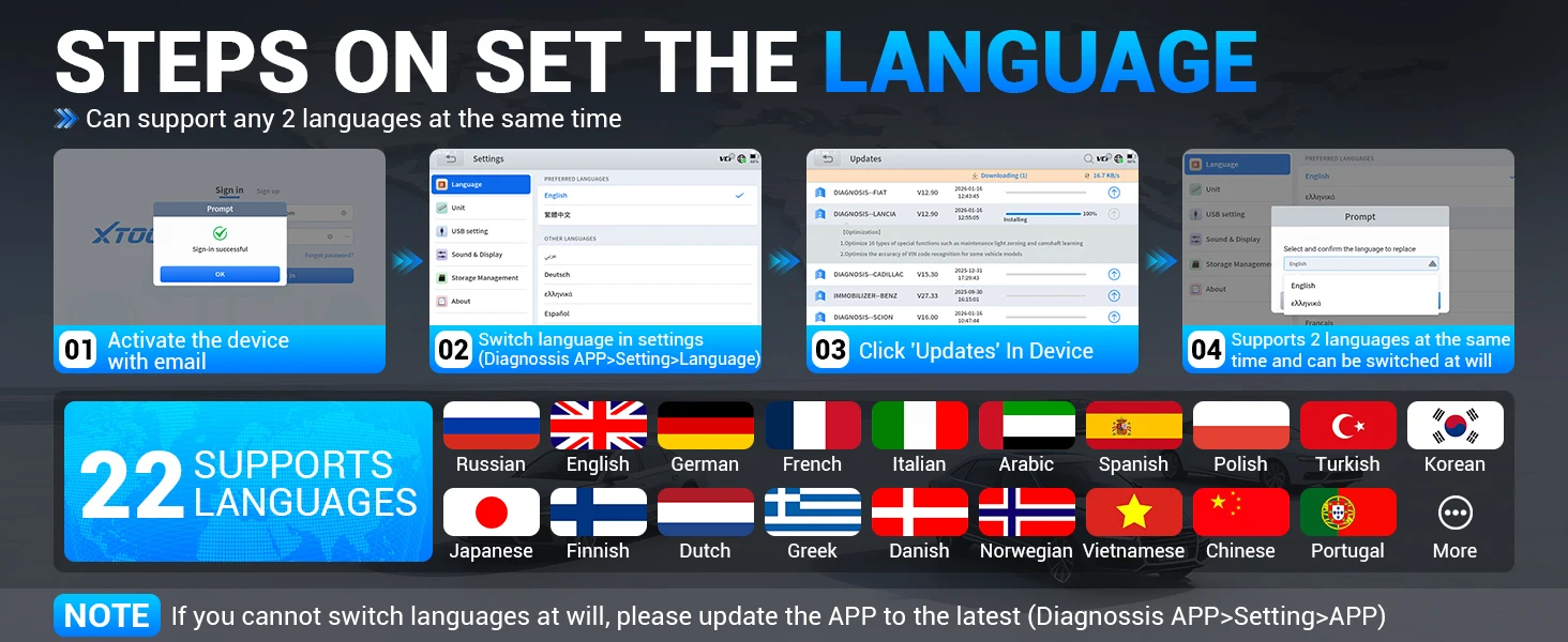 Note: If you cannot switch languages at will, please update the APP to the latest ('Diagnossis' APP>Setting>APP)