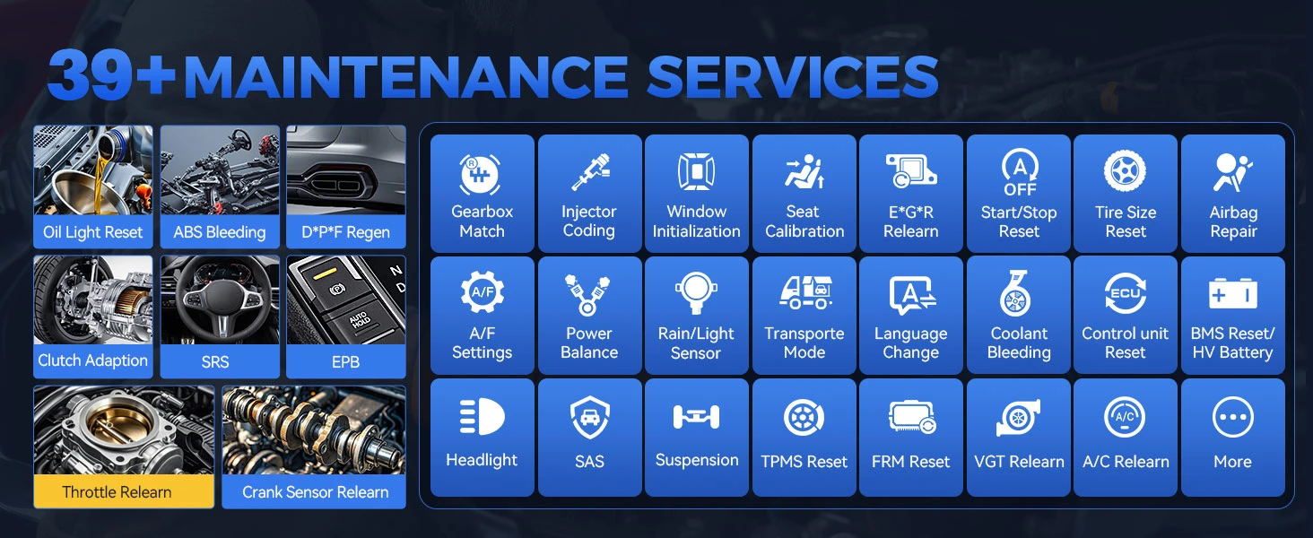 Also Includes: Window Initialization, Gearbox Match, Instrument Cluster, Headlight, Air Suspension, Crank Sensor Relearn, EEPROM Adapter, Airbag Repair, Cylinder, Seat Configurations, Coolant Bleeding, Disabled Transportation, Tire Size Reset, A/F Setting, Stop/Start Reset, Language Change and Reset Control Unit, Rain/Light Sensor, A/C Relearn, HV Battery, VGT Relearn, FRM Reset, EGR Relearn, SRS, Clutch Adaptation, Speed Limit etc.