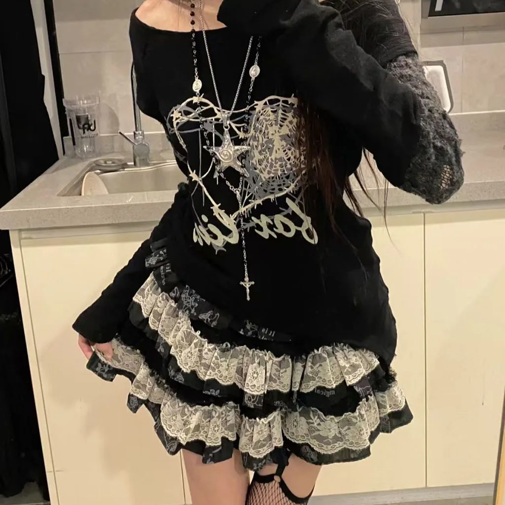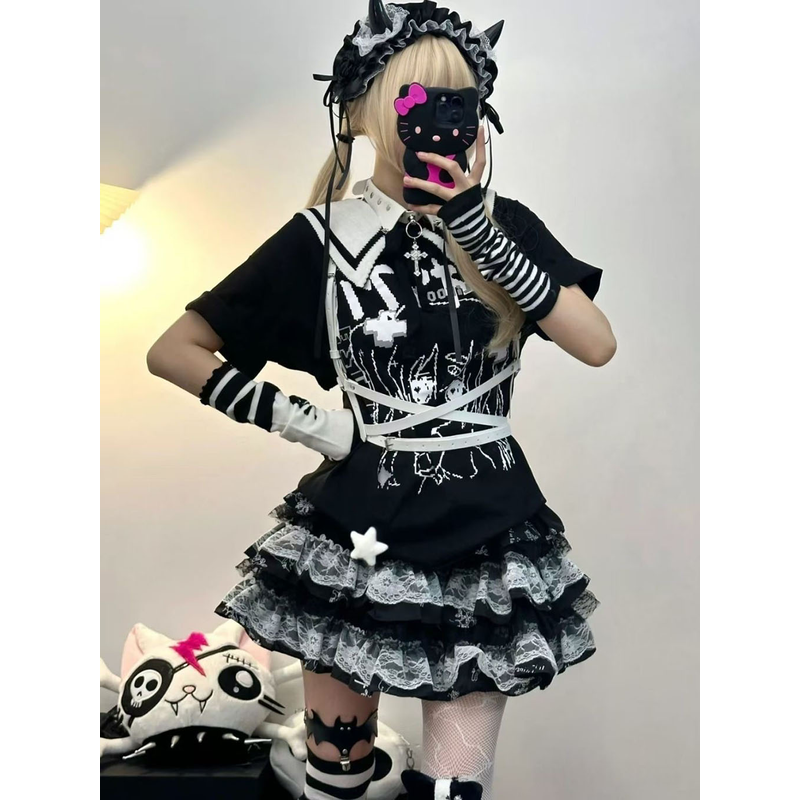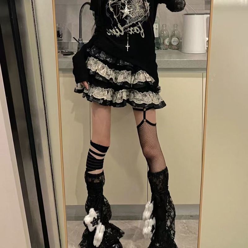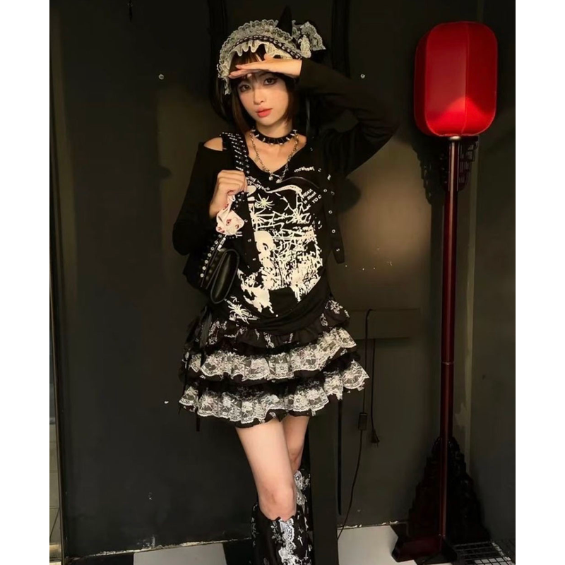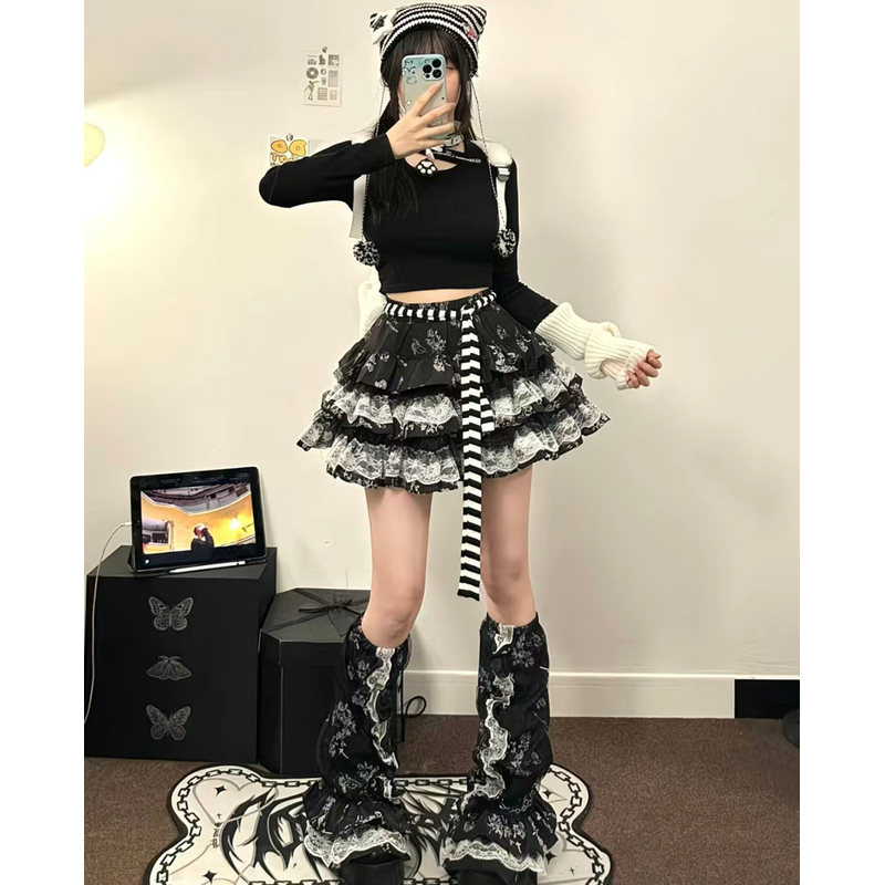 Dark Gothic Design: Black and White Contrasting Lace + Multi-layer Cake Skirt Skirt, creating a Y2K subculture atmosphere