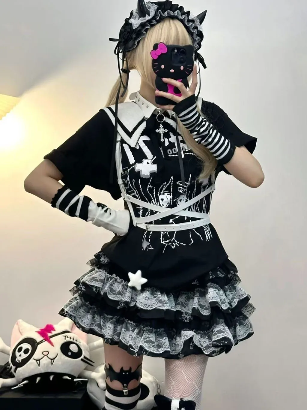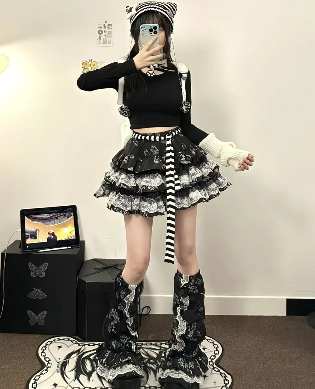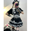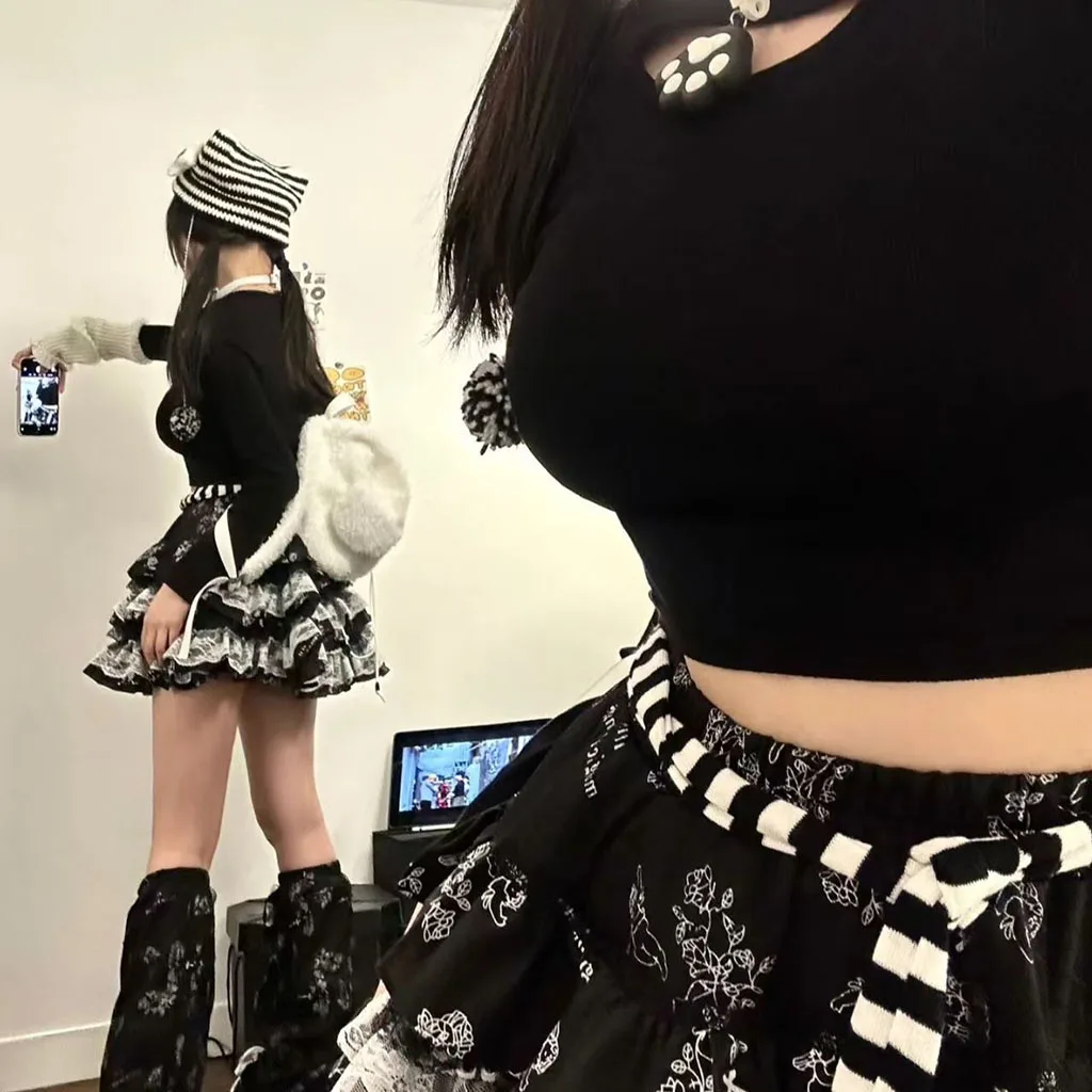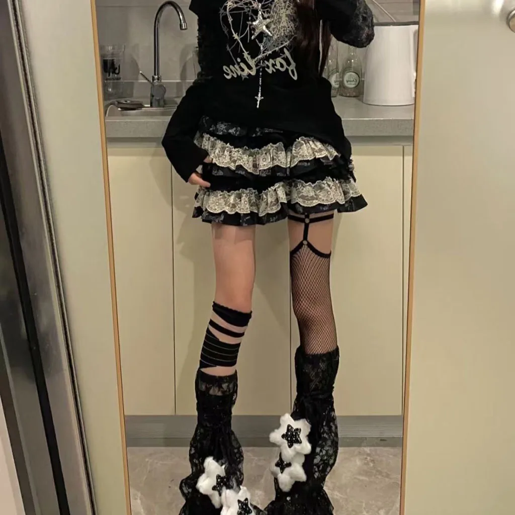 Dark Gothic Design: Black and White Contrasting Lace + Multi-layer Cake Skirt Skirt, creating a Y2K subculture atmosphere
