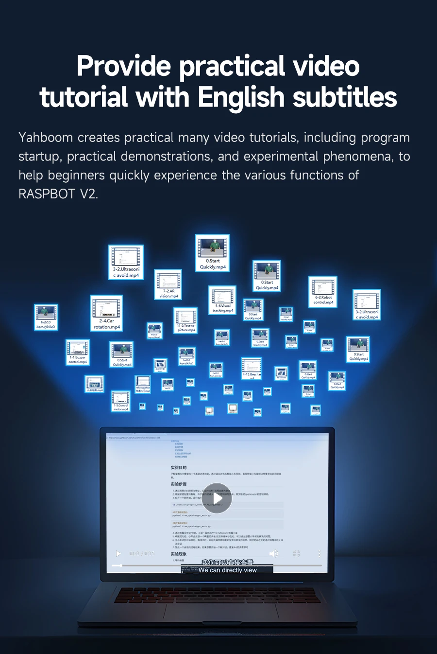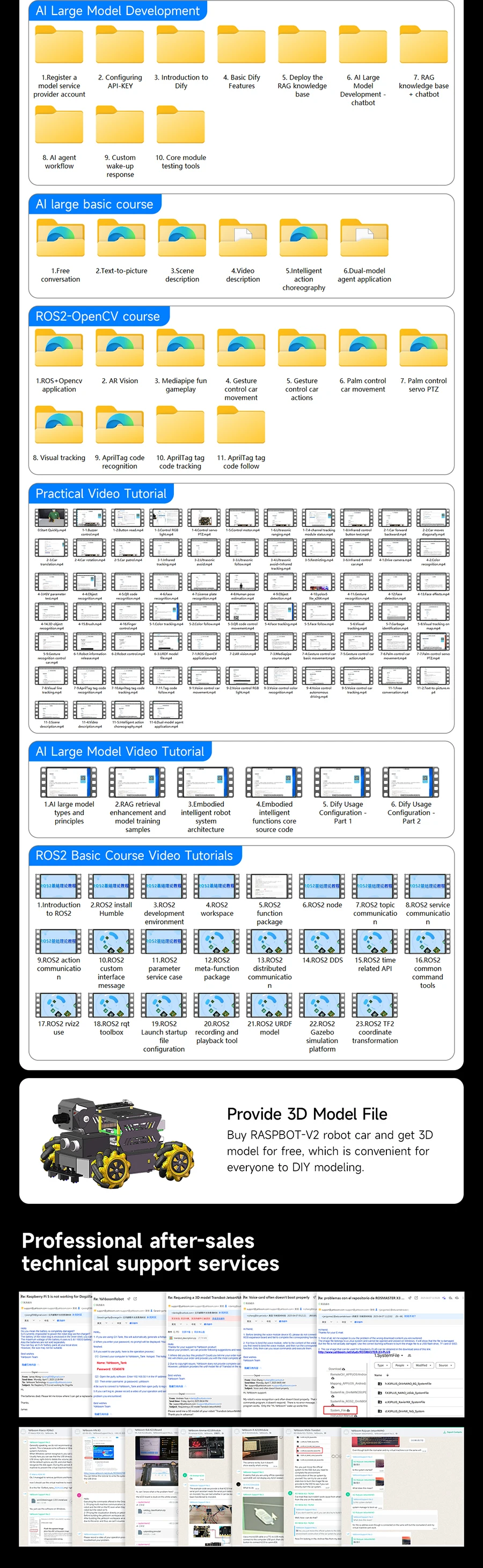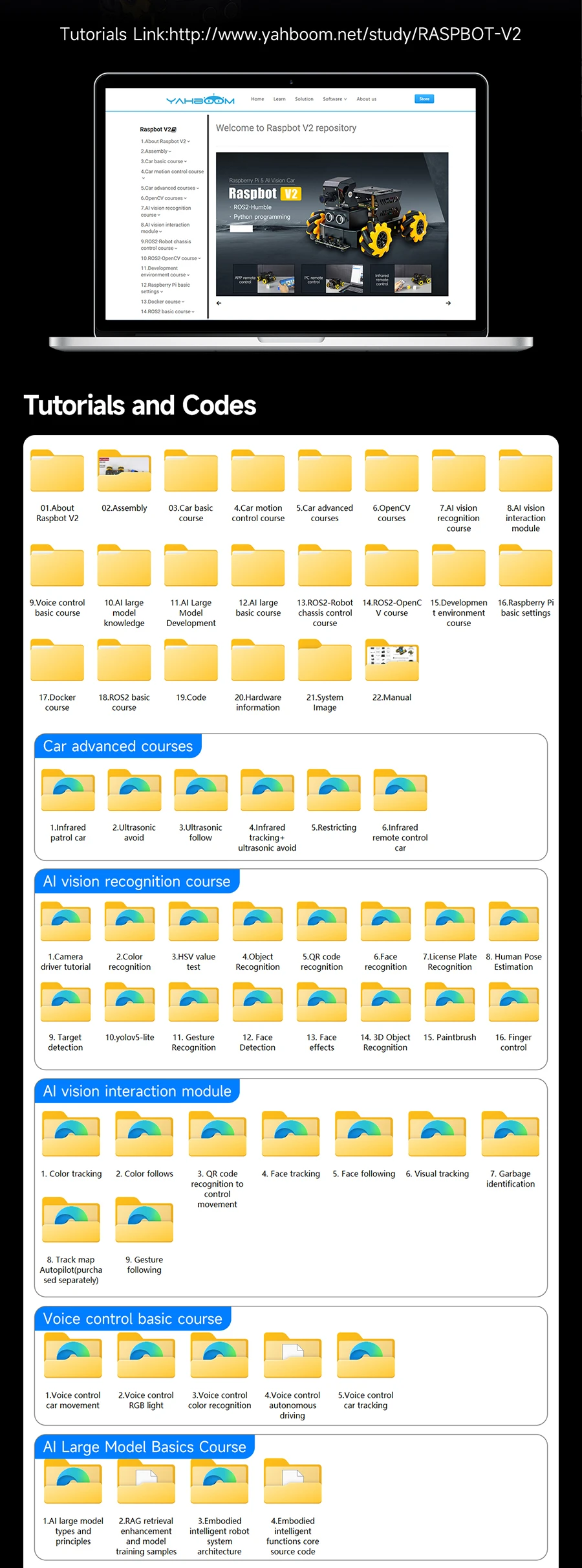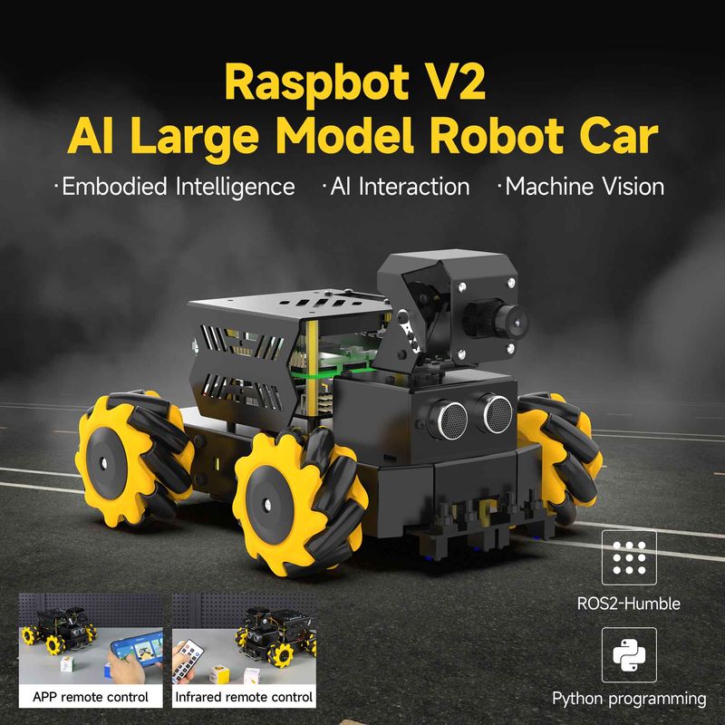 RASPBOT-V2 is an AI larger model robot car with a metal body bracket. It is equipped with Mecanum wheels to achieve 360° omnidirectional movement. Raspberry Pi 5 as the main control, Python as programming language. 1MP USB camera and 2DOF PTZ, combining with OpenCV image processing library and MediaPipe machine learning framework to realize color recognition, target tracking, license plate recognition, visual tracking, face recognition, gesture recognition, etc. Yahboom also provide it with accessories such as 4-channel tracking, ultrasonic, OLED display, RGB light bar, and comprehensive software and hardware support, which can be used in a variety of application scenarios such as intelligent robot learning, artificial intelligence development and competition projects. Raspbot-V2 is not only suitable for individual developers and students, but also widely used in education, scientific research and innovation projects.