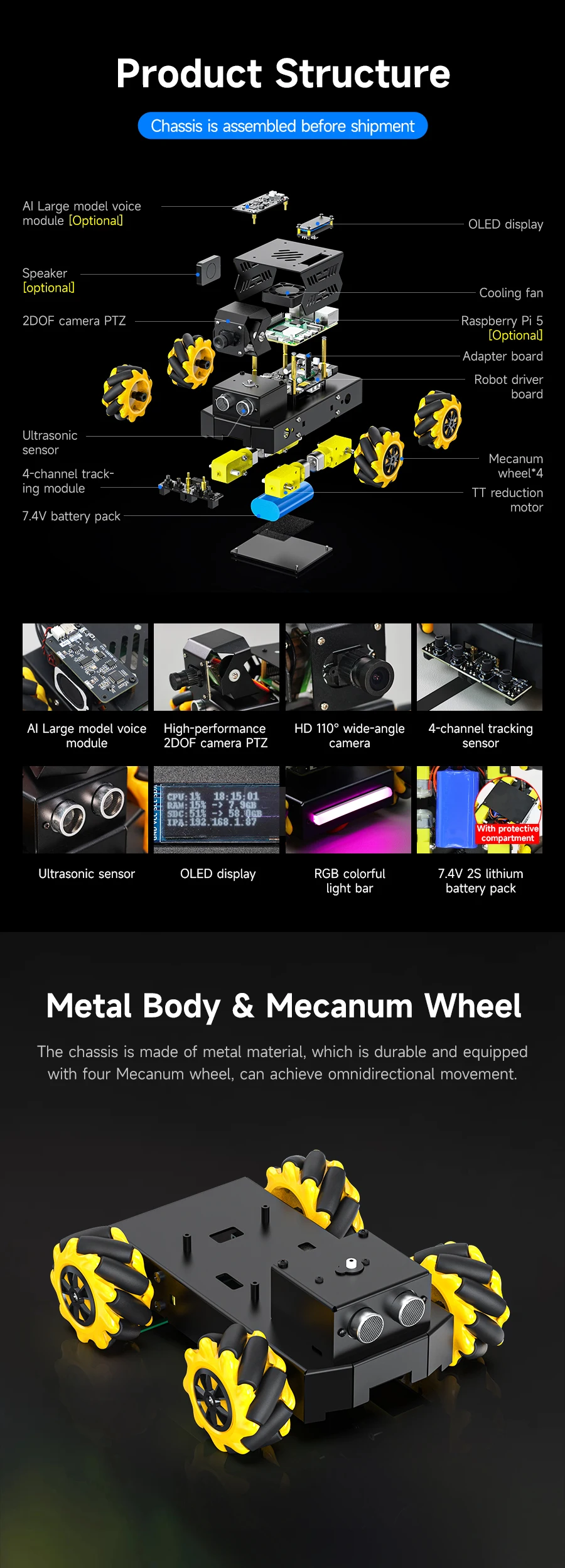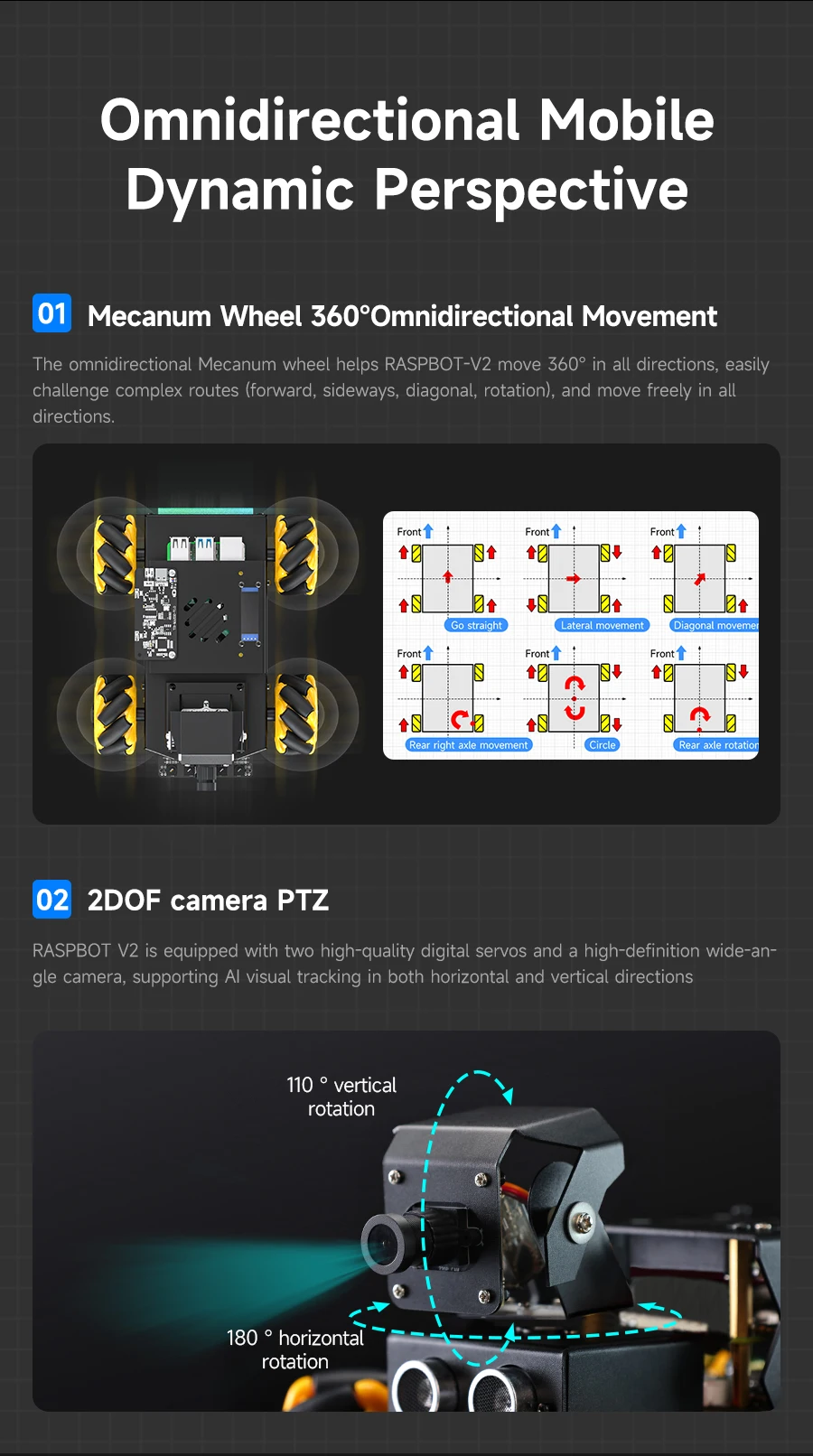 ◆360° omnidirectional movement: Mecanum wheels and 4-channel independent drive motors, it can easily achieve all-round flexible movement and adapt to complex terrain.