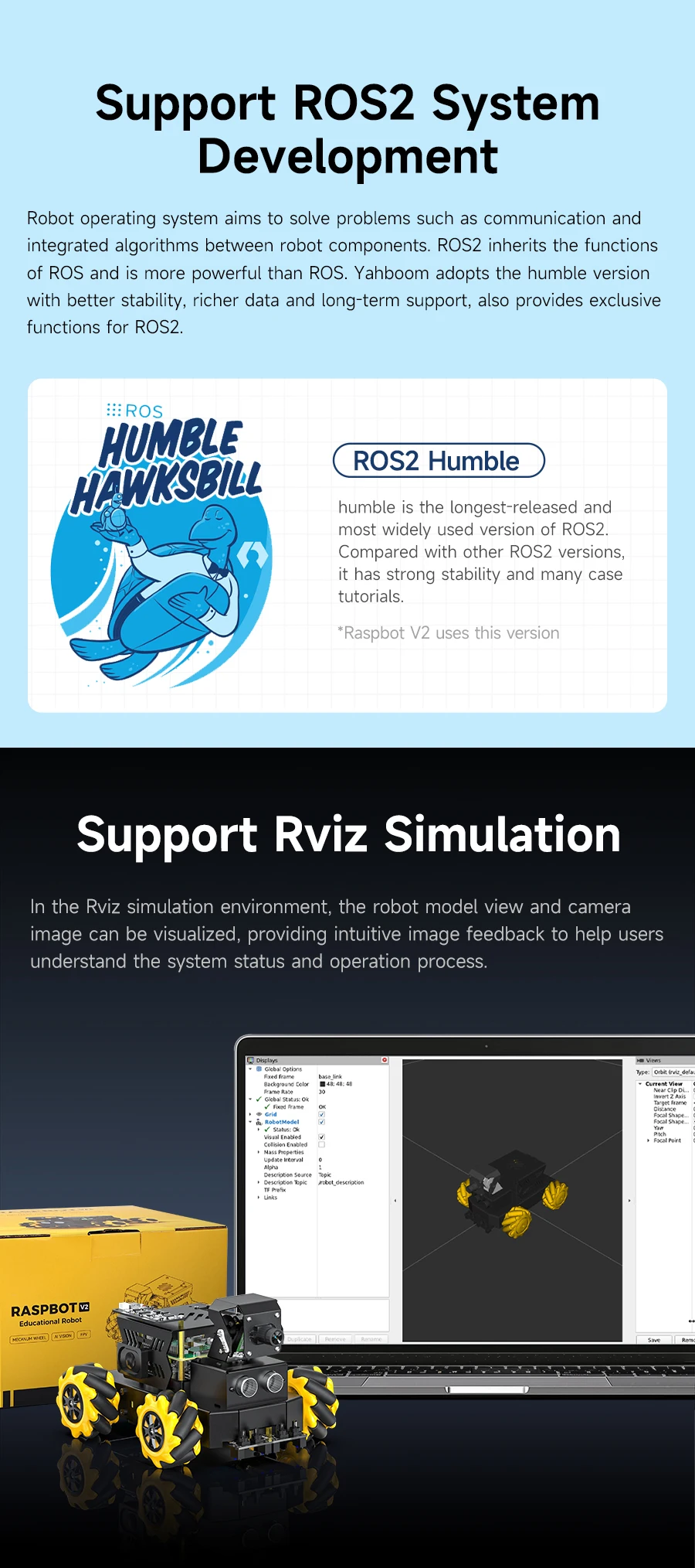 ◆Raspberry Pi 5 as main control: Combined with ROS2-Humble operating system and Python programming environment. The simple programming interface and rich sensor modules make Raspbot-V2 suitable for ROS beginners to quickly get started.