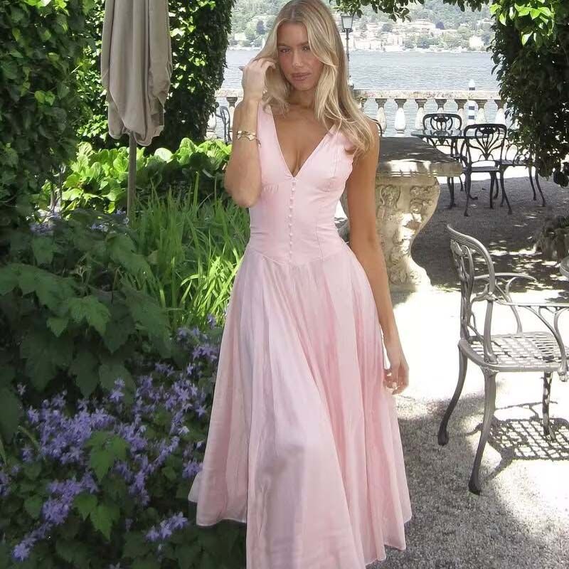 Summer Women Elegant Pink Tank Dresses Sexy Sleeveless V Neck A-line Midi Long