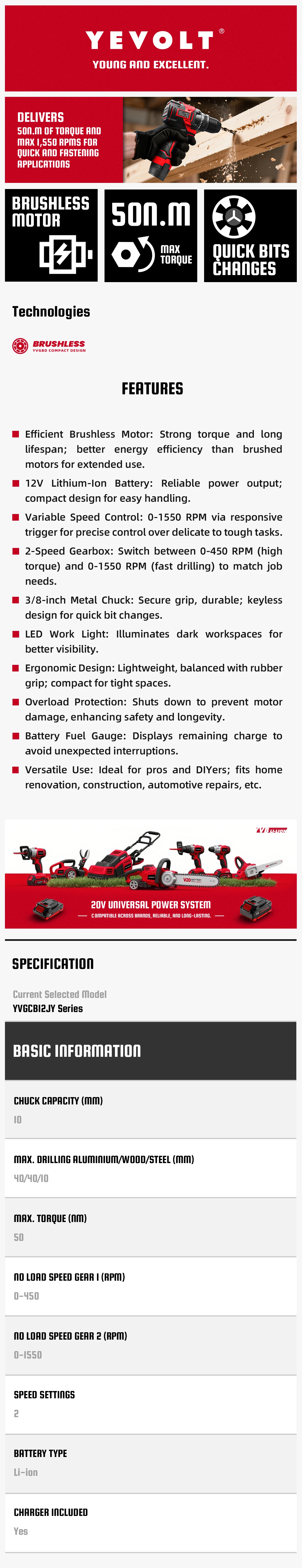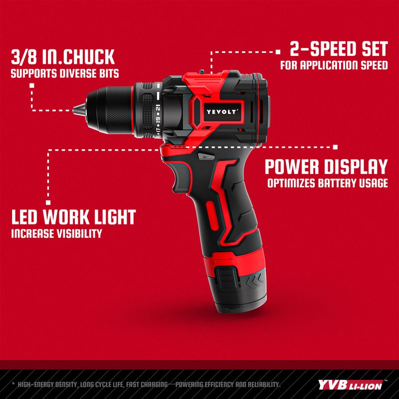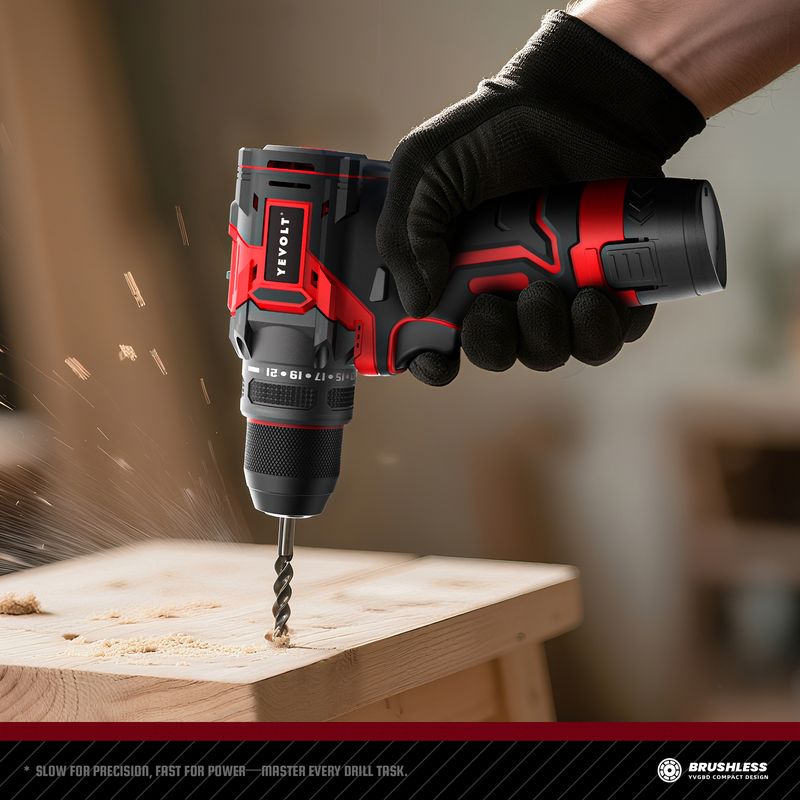 YEVOLT 12V Brushless Electric Cordless Drill Driver 2-Speed Electric Drill Compact Power Drill for Home DIY & Woodworking