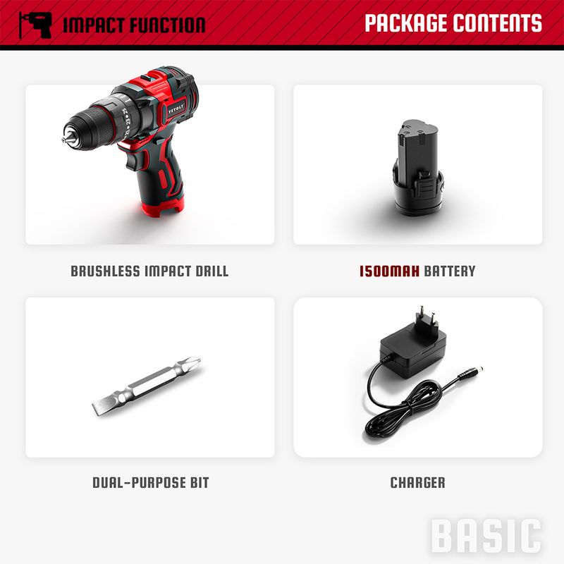 YEVOLT 12V Brushless Electric Cordless Drill Driver 2-Speed Electric Drill Compact Power Drill for Home DIY & Woodworking