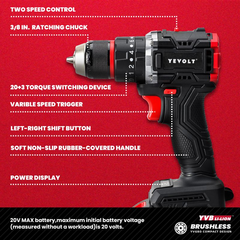 YEVOLT Brushless Electric Drill Set 20V YVGBD20DU3 Series 20+3 Torque Compact Impact Cordless Handheld Screwdriver Power Tool