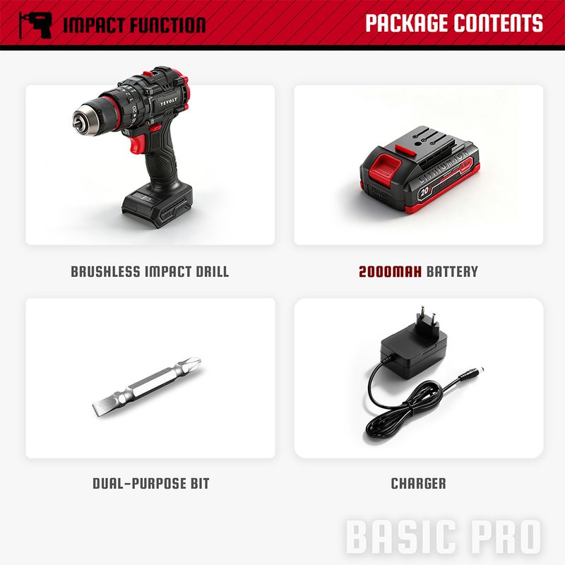 YEVOLT Brushless Electric Drill Set 20V YVGBD20DU3 Series 20+3 Torque Compact Impact Cordless Handheld Screwdriver Power Tool