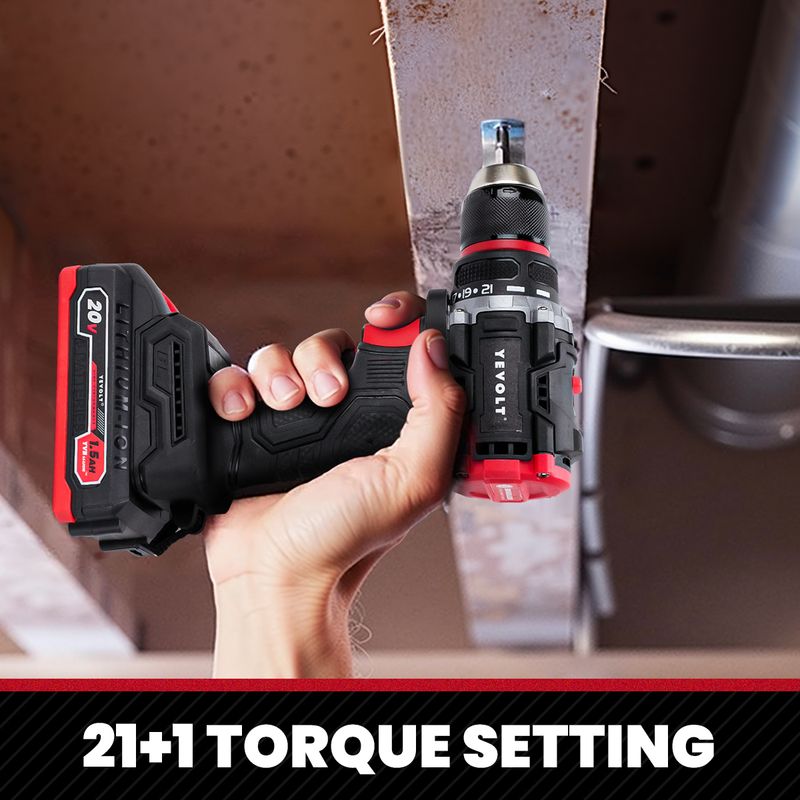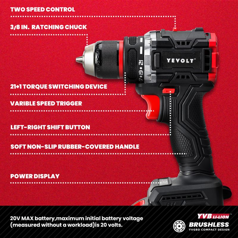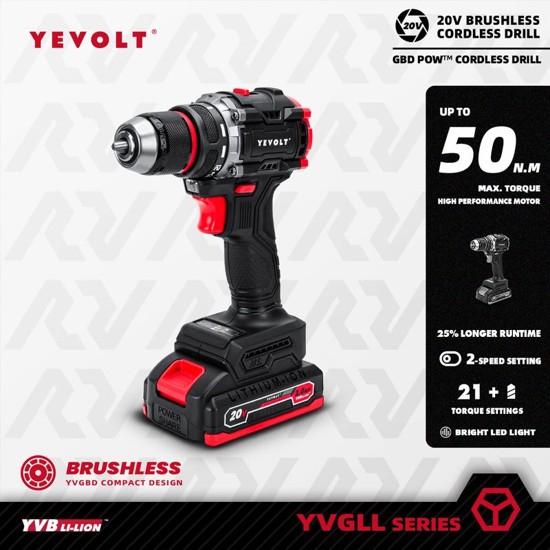 YEVOLT Electric Drill 20V Brushless Li-ion Compact Cordless 21+1 Driver Handheld Screwdriver Power Tools YVGBD20DU2 Series