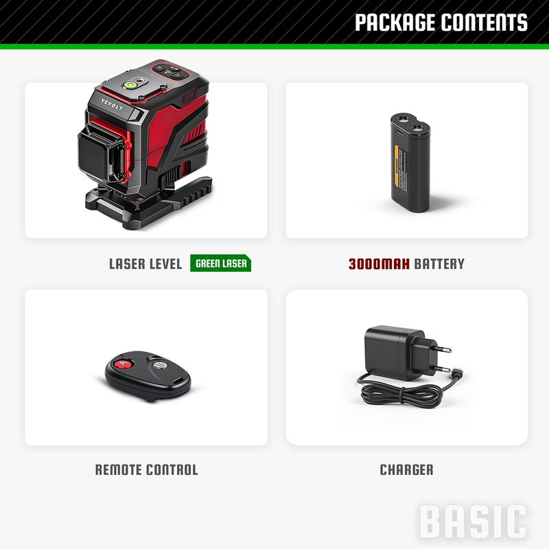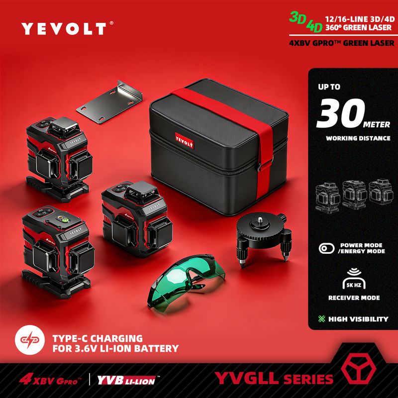 YEVOLT Green Laser Level 3/4-Plane 12/16-Line Self-leveling 360 3D/4D Horizontal & Vertical Power Measuring Tool YVGLL4XS-Series
