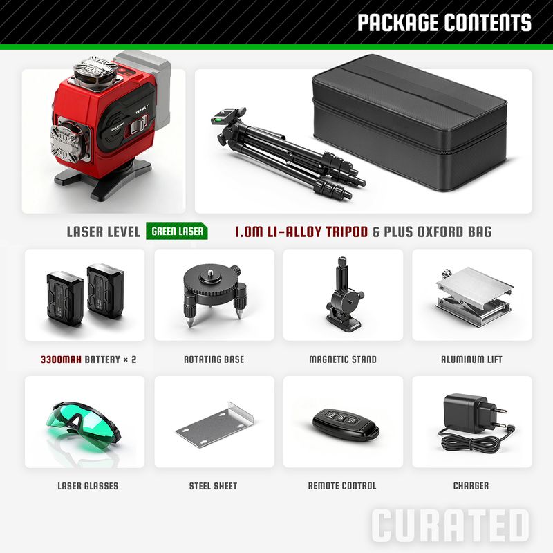 YEVOLT Green Laser Level YVGLL4CH16-Series 4-Plane 16-Line Self-leveling 360 4D Power Tools Measuring Tool Tripod