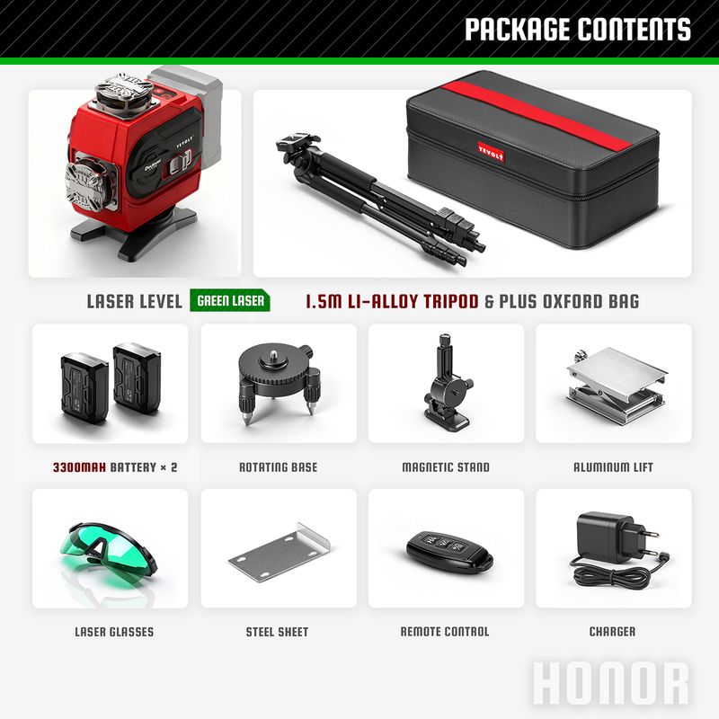 YEVOLT Green Laser Level YVGLL4CH16-Series 4-Plane 16-Line Self-leveling 360 4D Power Tools Measuring Tool Tripod