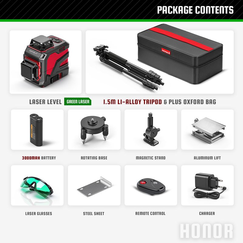 YEVOLT YVGLL4XS12 Laser Level 12-Line Green Beam ±0.2mm/m Precision, IP54 Dust/Water Resistance, Auto-Leveling & Slope Mode​