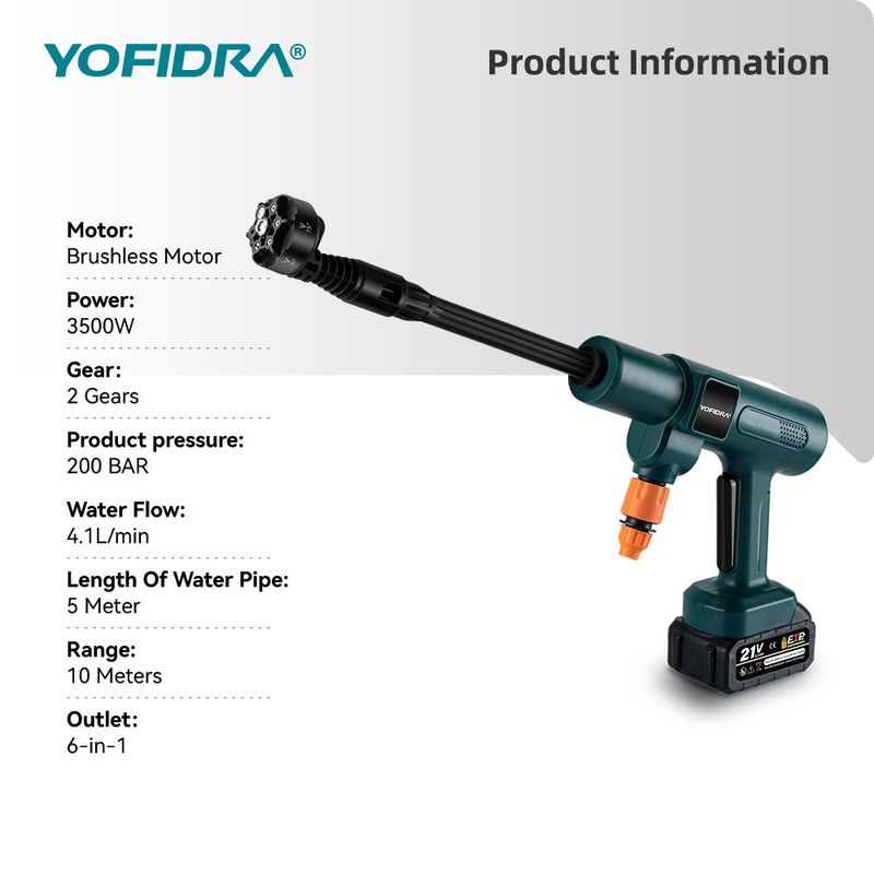 YOFIDRA 200Bar 3500W Brushless Electric High Pressure Washer 6 IN 1 Cordless Car Washing Spray Gun for 21V Battery Garden Water Gun
