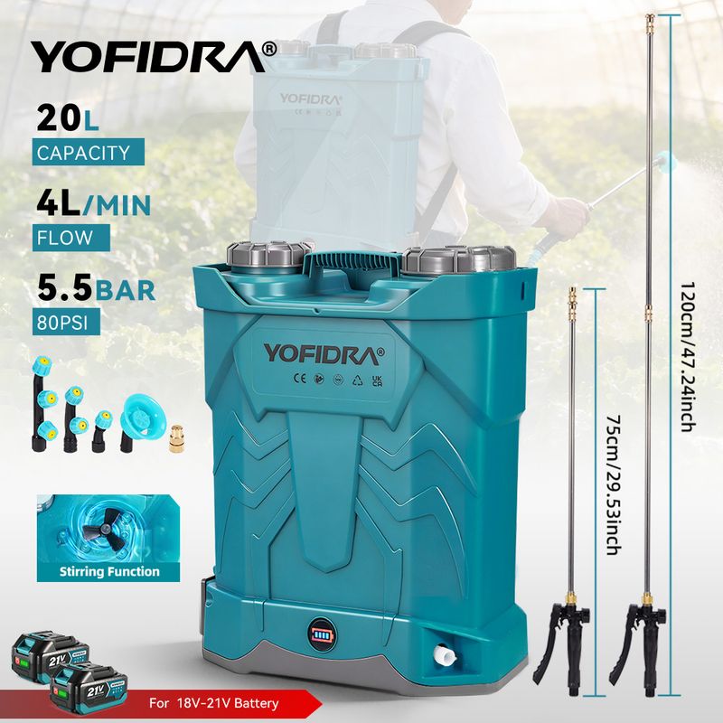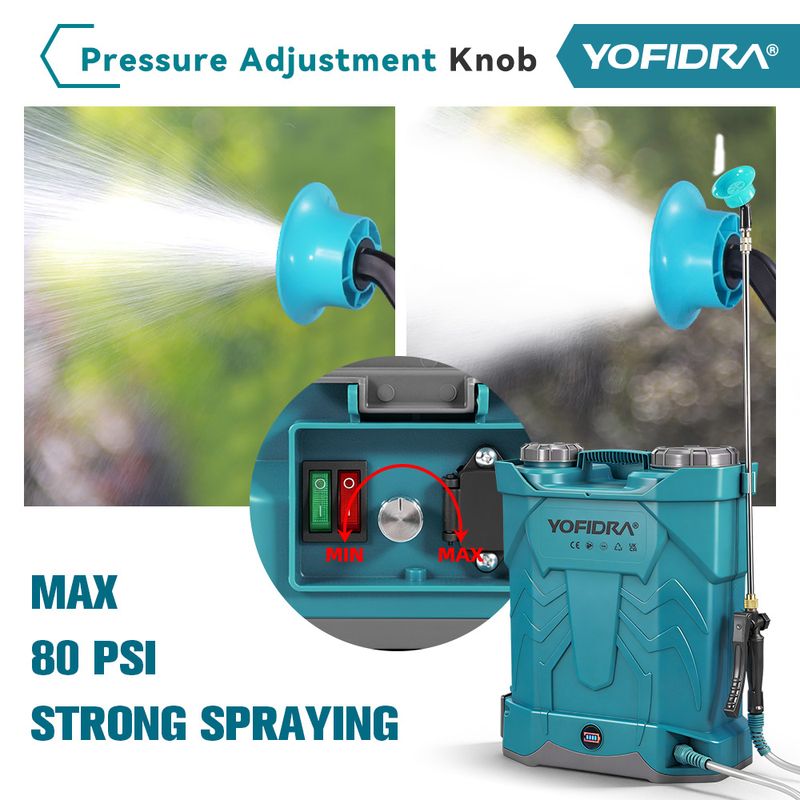 --No need for manual pumping: spraying has never been so simple! YOFIDRA's battery powered spray uses a durable lithium-ion battery, which can directly spray with only one charge. The maximum pressure of the pump is 80 psi, and the flow rate can reach 4.0 L/min. A capacity of 20 liters is sufficient to meet your daily needs, saving you labor and time.