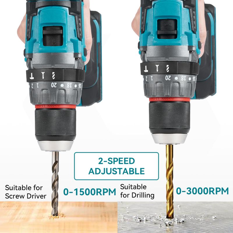 - 3 in 1 Hammer Drill Function/ Screwdriver Function/ Flat Drill Function.