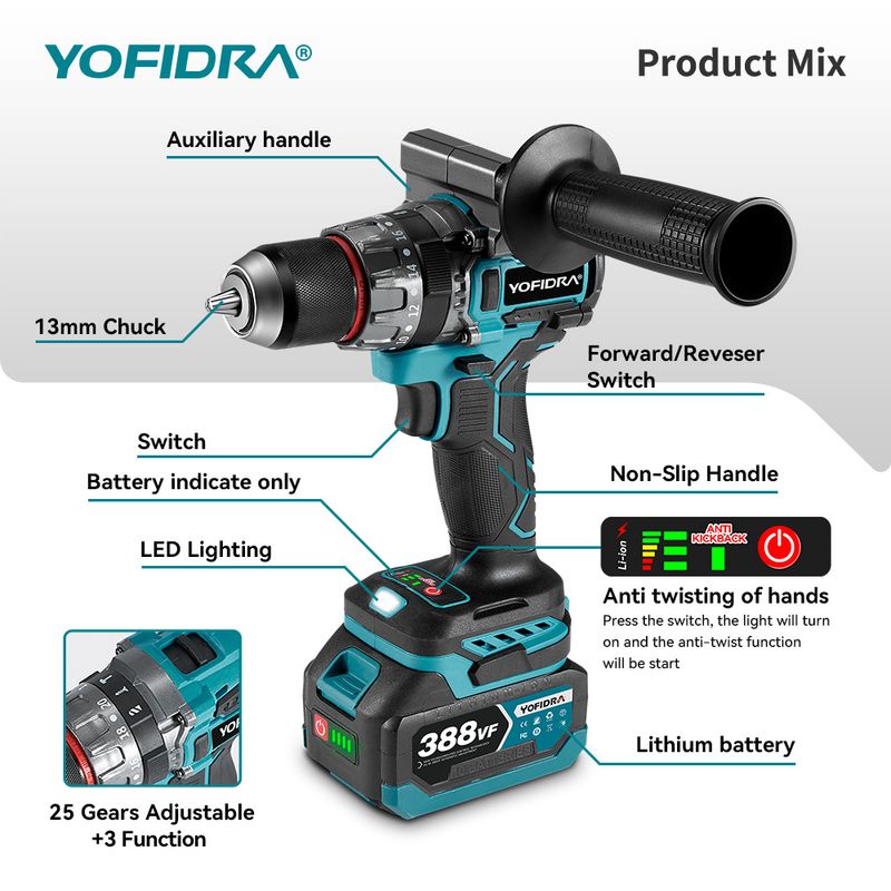 YOFIDRA 700N.m 13mm Brushless Electric Drill  Multifunction Home DIY Ice Breaking Power Tools For 18V Battery