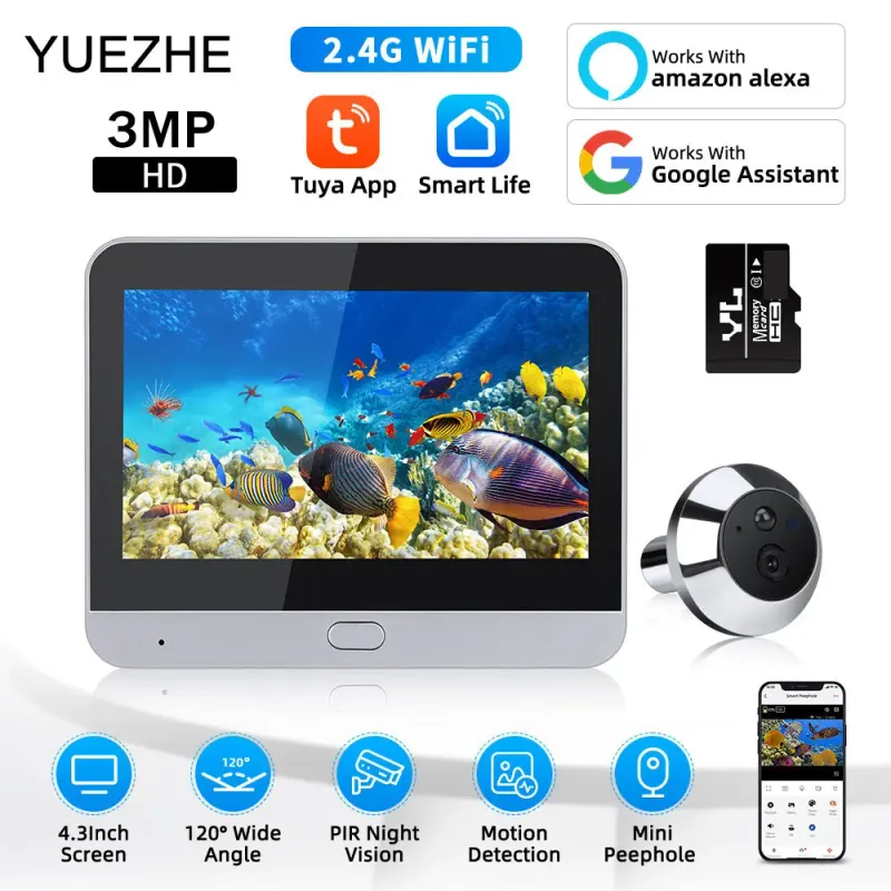 Yuezhe Smart WiFi 3MP Tuya Video Door Peephole Camera 4.3inch Screen 5000mAh PIR Motion Alarm Alexa Viewer for Home Security