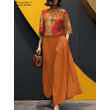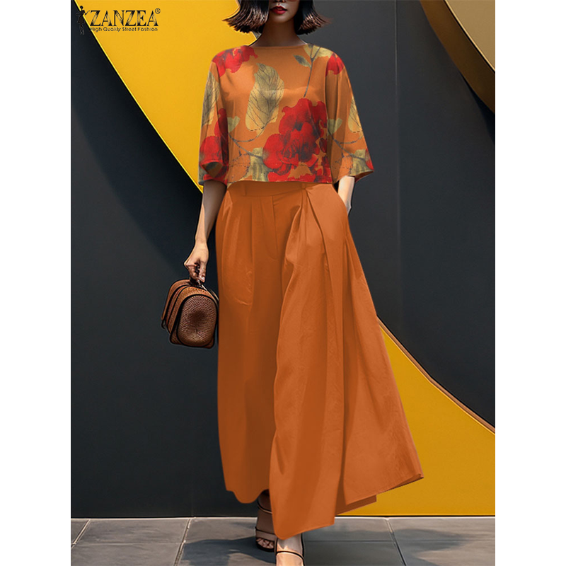 ZANZEA Women's Loose Pant Sets Casual 3/4 Sleeve Floral Crop Tops & Wide Leg Pants 2-Pieces Suits Summer Commuting Solid Outfits