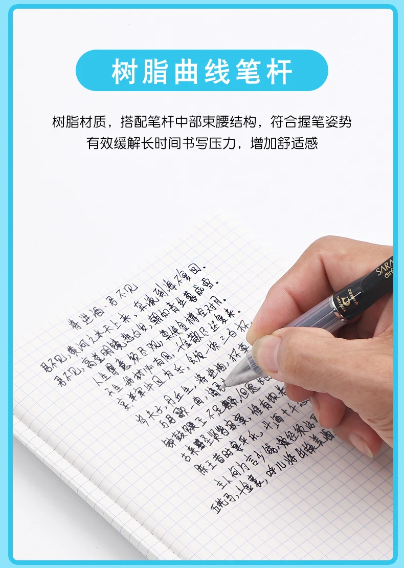 5. Resin curved pen shaft; resin material, with a waist structure in the middle of the pen shaft, conforms to the grip posture effectively relieves the pressure of long-time writing, and increases comfort