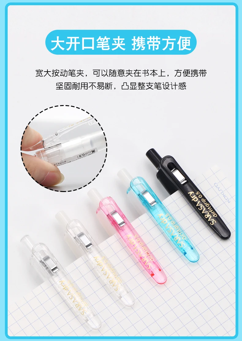 8. Vibrant colors, a variety of to choose from; 0.5mm pen(black shaft black clip, white shaft transparent clip, white shaft blue clip, white shaft pink clip, transparent shaft transparent clip); 0.4mm pen (transparent shaft white clip, black shaft black clip, railing white clip, pink shaft white clip)
