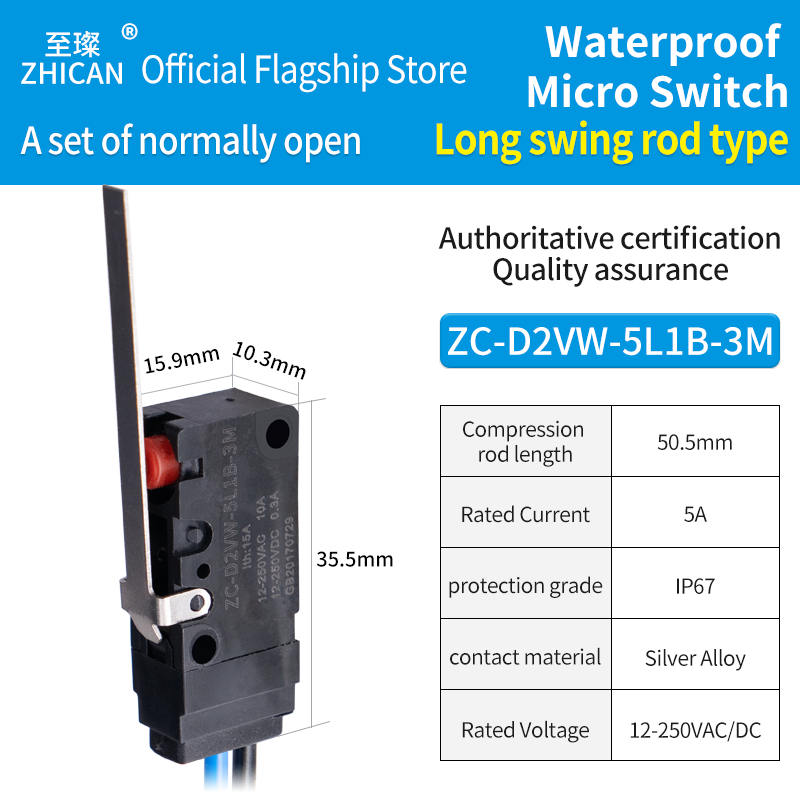 ZHICAN IP67 waterproof micro switch small limit switch 5L1B-1M/5L2A/5L3-3M one open one closed with wire roller button switch