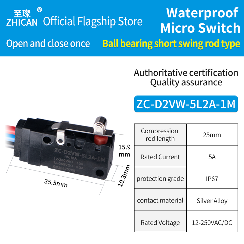ZHICAN IP67 waterproof micro switch small limit switch 5L1B-1M/5L2A/5L3-3M one open one closed with wire roller button switch