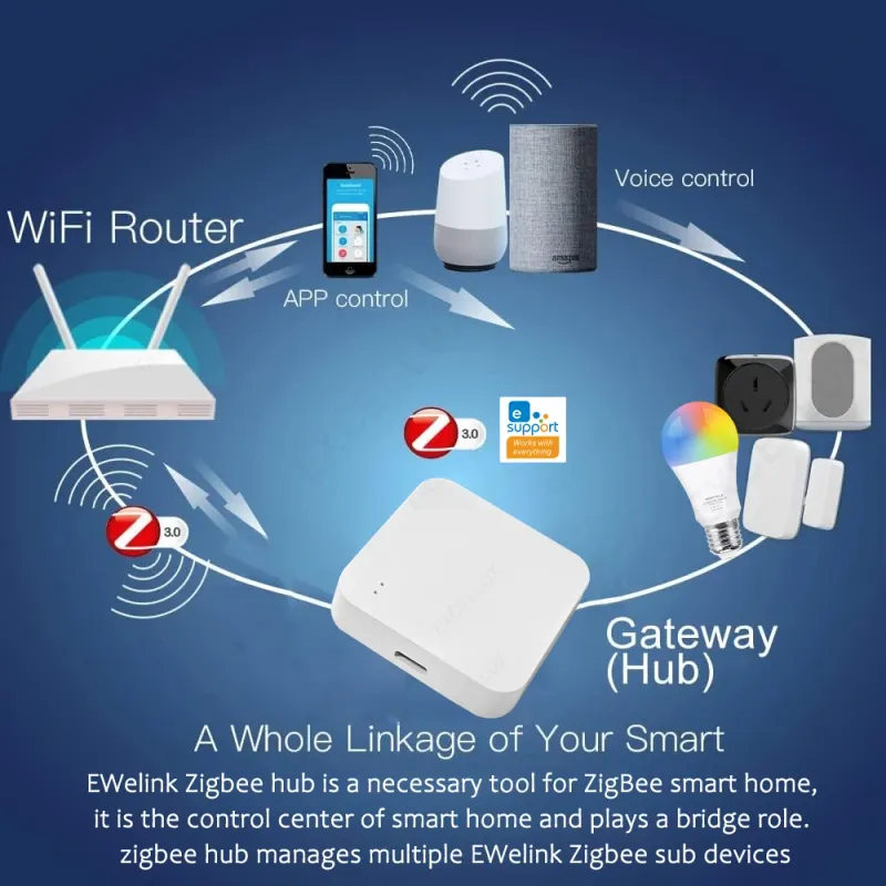 Smart Home Controlling Center - Zigbee gateway, a controlling center for smart home system. It adapt eWeLink zigbee 3.0 protocol and can connect up to max 50 smart home device base on zigbee protocol and Zigbee 3.0 protocol, like zigbee smart socket, zigbee smart bulb, zigbee door sensor, zigbee Smart Thermostat, zigbee water detector, zigbee smoke detector ect.