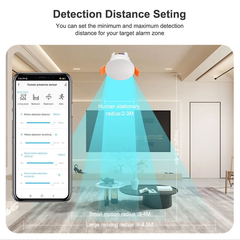 Featured as human presence,human static,human micro motion and human movement motion detection to detect the presence or absence of people in the area,even to detect the static state such as personnel sleeping accurately with mmWave Radar Detection featured.