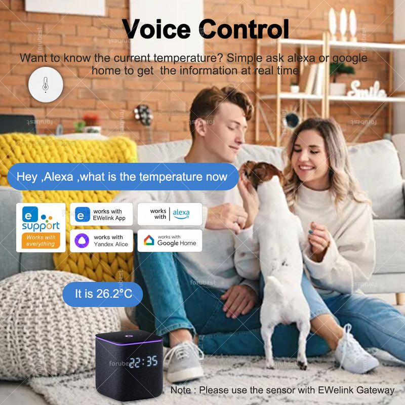 【Support other third-part voice assistant 】 You can use one Ewelink gateway to add devices on ewelink app first ,then bind the device with yandex alice , alexa ,google assistant ,or smartthings,then use voice control to ask the temperature and humidity .